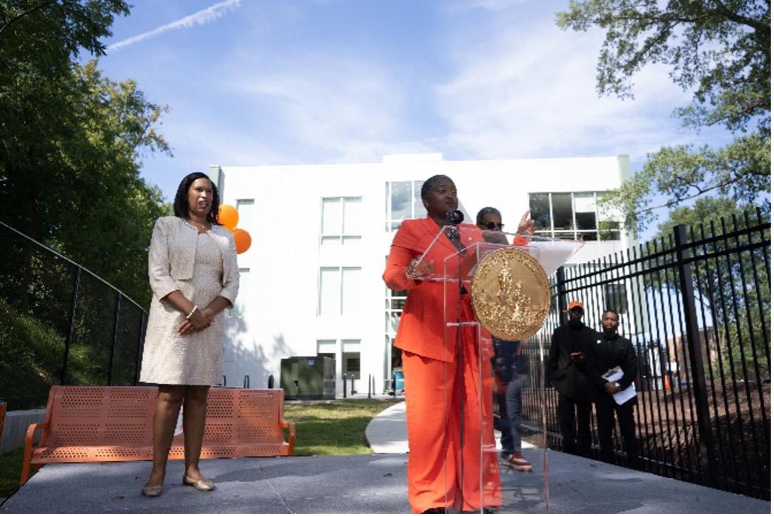 (Pictured: DC Mayor Bowser and Monica T. Ray, CC Prep Board Chair with remarks at the ribbon cutting )
