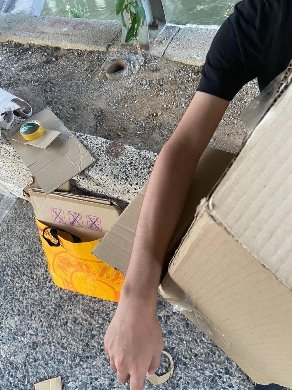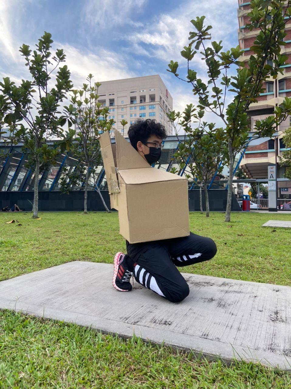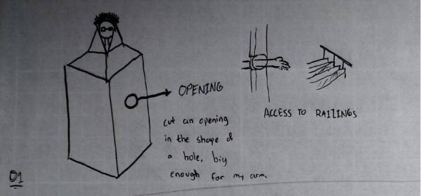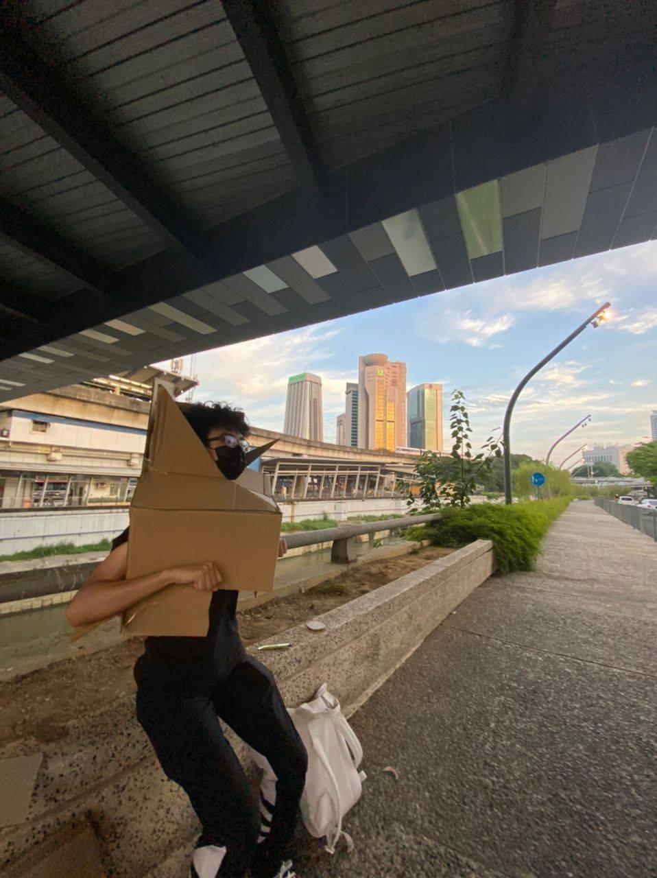 Location MRTStation,PasarSeni Operation Icutasimilarrectangularopeningfromtheprevious modification,butinthefrontpartofthecardboard structure. Action IsatdownontheparkoutsideoftheMRTStation. Theopeningallowedmyselftositinacomfortable positionwheremylegsweren'tobstructedbythe cardboardstructure. 23 Before After P O V Thefrontopeningcombinedwiththerearopeningcreates fluidityinthemovementsoftheapparatususer. Inthiscase,itallowstheusertositdownonthefloor,whilemaintainingthe structuralintegrityoftheapparatus. However,itcanallowotherfluidmovementsaswell,suchasrunningor stretching. Function5
