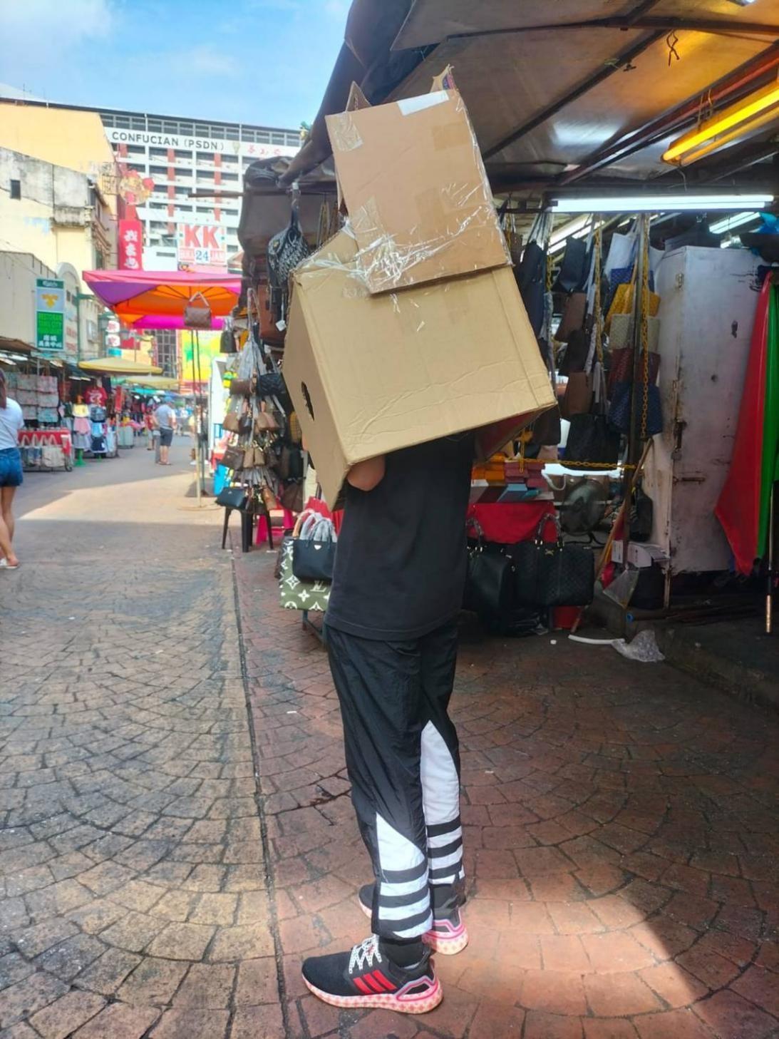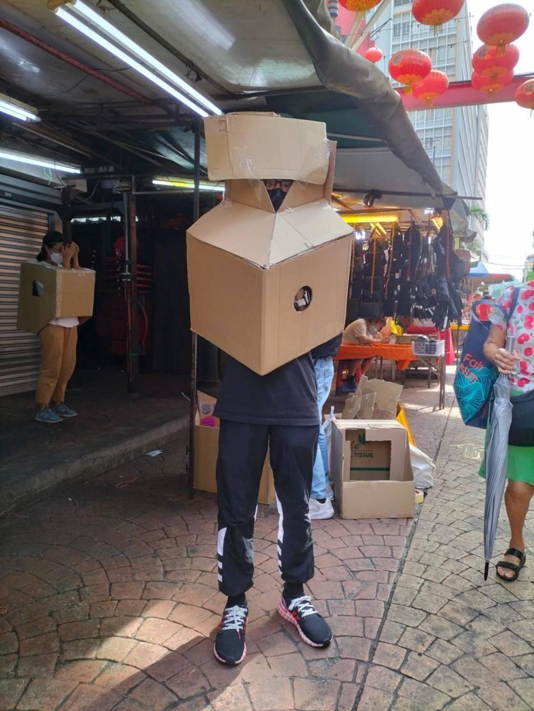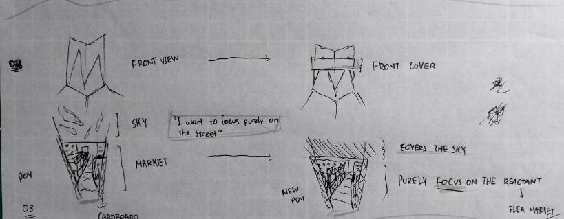 Location FleaMarketPetalingStreet Operation Iaddedatopcovertotheupmostpartoftheslanted areaofthecardboard Action Thecovereliminatedtheskyfrommypointofview insidethecardboardstructure,allowingmyselfto focusonthemarketstreetanditsdetails. 21 Before After P O V Thefrontcovereliminatestheupperpartoftheuser'sfieldofvision, forcingtheuser'seyesighttofocusonwhatisvisible. Theremovaloftheupperfieldofvisionignorestheskyandfocuses theviewofthestreetfromtheuser'sperspective. Function3