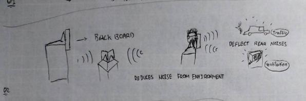 Location AlleywayinJalanHangKatsuri Operation Attached2flatplanestotheupperpartofthe structure,angledat90degrees. Action The2flatplanesbehindmyheadminimizedthe soundcomingfromthevariousloudnoisesinthe city.Thealleywayspecificallyhadloudexhaust ventilationandairconditioning,sothe2backpanels reducedthenoise. 20 BeforeAfter P O V Inthealleyway,therewasasetofventilationandairconditioner compressorswhichwereveryloud.Thebackpanelsreactedwith thenoisetoblockthemoff. Inaddition,duringthefieldstudy,therewasconstantnoiseinthe bustlingpartsofthecity.Thebackpanelshelpedtoreducethenoise,even thoughthereductionwasnotthatsignificant. Function2