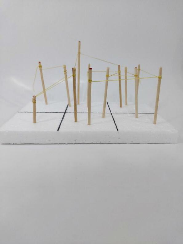 Visualizationofform Thepathandactionstakenare representedintheformofamodel, consistingofmultiplesticks(point) connectedbystrings(line)withvarying heights(elevation). 03