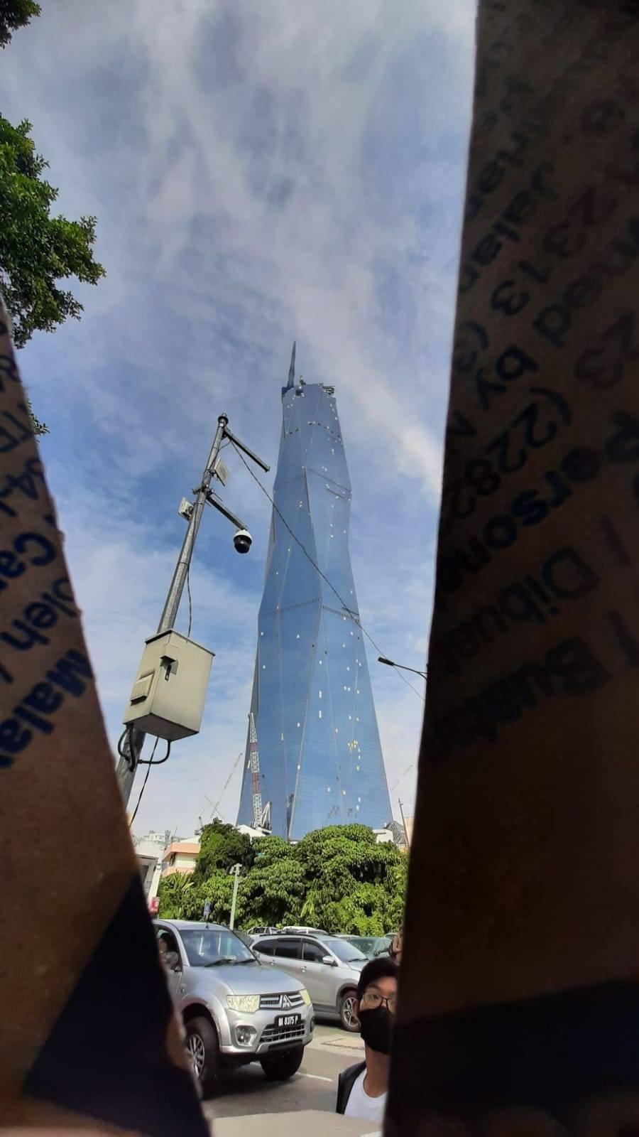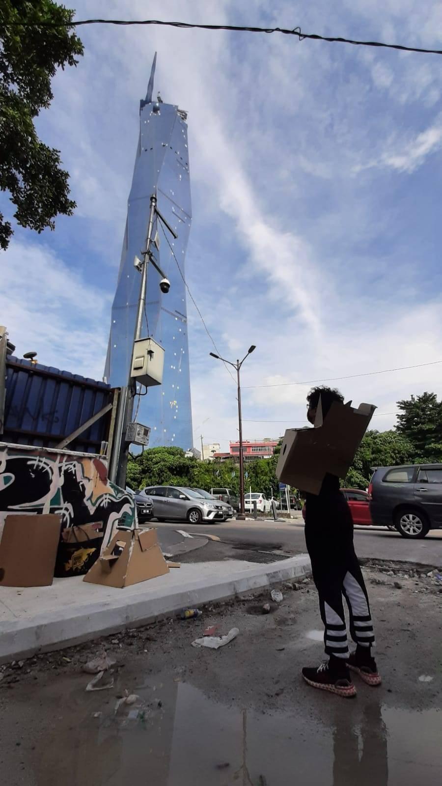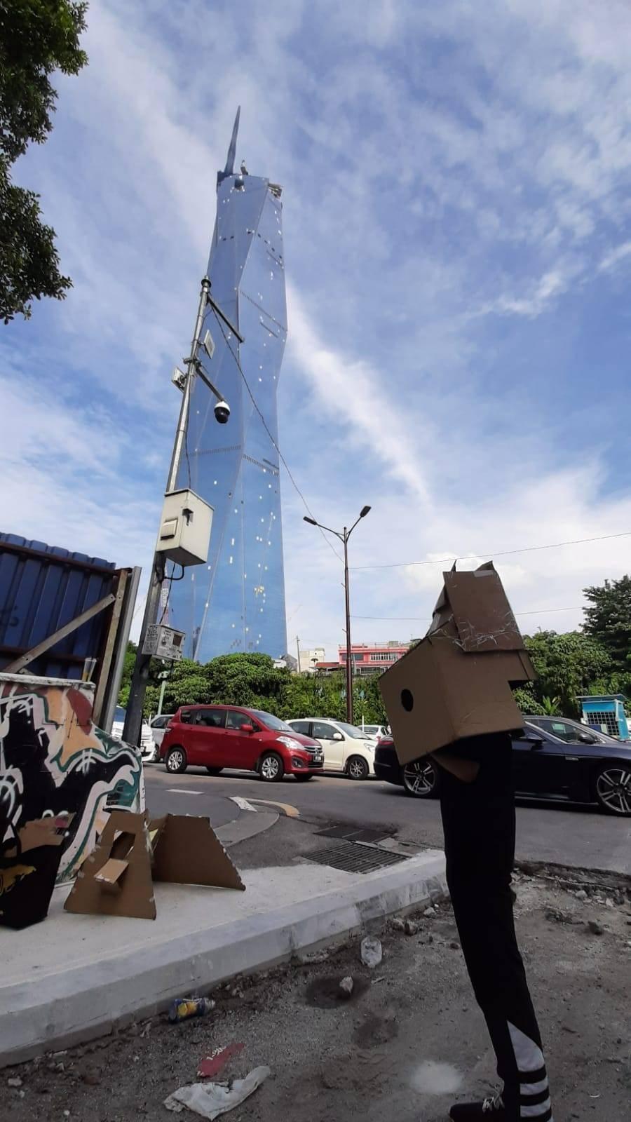 Location PasarKaratAlleyway Operation Icutarectangularopeninglocatedatthelowerback ofthecardboardstructure,andremovedthe previousheadcover. 22 Before After P O V Action Theopeningallowedmyselftopositionmybodyto betterviewthereactant(MerdekaTower)witha morecomfortablepose. Thefrontcovereliminatestheupperpartoftheuser'sfieldofvision, forcingtheuser'seyesighttofocusonwhatisvisible. Theremovaloftheupperfieldofvisionignorestheskyandfocuses theviewofthestreetfromtheuser'sperspective. Function4 Comparedtothepreviouslocations,thisreactantisveryfaraway.Thetoweris roughly381timestallerthantheuser(myself)andisdistancedaround300 metersaway.Usingthepythagorastheorem,thedistancefromtheusertotheverytop oftheantennaspireisaround742meters.