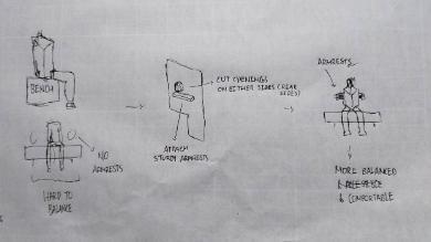 Location SideofKlangRiver,JalanTunSambanthan Operation Iaddedasmallplatformonbothsides,each accompaniedbyanopeningdirectlyonthesides. Action Thesupportingplatformsactedasarmrests,asthe benchestheredidn'thaveany.Theopeningwasto allowbotharmstopassthroughthestructureand restcomfortablyonthearmrests. 24 Before After P O V Thesupportingarmrestsprovideacomfortable sittingposition,makinguseofnotonlybencheswithoutarmrests,butanyflat surfacewhichcanbesaton. Itisessentiallyauniversalarmrestwhichcanbebroughtanywhere. Italsoisn'tlimitedasanarmrest,butitcanalsosupportthearmswhiledoing otheractivities Function6
