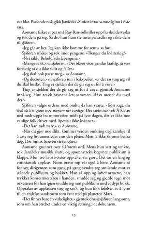 var klar. Passende nok gikk Janáčeks «Sinfonietta» samtidig inn i siste sats. Aomame fisket et par små Ray Ban-solbriller opp fra skulderveska og tok dem på seg. Så dro hun fram tre tusenyensedler og rakte dem til sjåføren. «Jeg går av her. Jeg kan ikke komme for sent,» sa hun. Sjåføren nikket og tok imot pengene. «Trenger du kvittering?» «Nei takk. Behold vekslepengene.» «Mange takk,» sa sjåføren. «Det blåser visst ganske kraftig, så vær forsiktig så du ikke sklir og faller.» «Jeg skal nok passe meg,» sa Aomame. «Og dessuten,» sa sjåføren inn i bakspeilet, «er det én ting jeg vil du skal huske. Ting er sjelden det de gir seg ut for å være.» Ting er sjelden det de gir seg ut for å være, gjentok Aomame inni seg. Hun trakk brynene lett sammen. «Hva mener du med det?» Sjåføren valgte ordene med omhu da han svarte. «Kort sagt, du skal så å si gjøre noe utenom det vanlige. Det stemmer vel? Å klatre ned nødtrappa fra motorveien midt på lyse dagen, det er ikke noe vanlige folk driver med. Spesielt ikke kvinner.» «Det kan nok være,» sa Aomame. «Når du gjør noe slikt, kommer verden omkring deg kanskje til å arte seg litt annerledes enn den pleier. Men la ikke skinnet bedra deg. Det finnes bare én virkelighet.» Aomame grunnet over sjåførens ord. Mens hun satt og tenkte, tok Janáčeks musikk slutt, og sporenstreks begynte publikum å klappe. Mon tro hvor konsertopptaket var gjort. Det var en lang og entusiastisk applaus. Noen bravo-rop var også å høre. Aomame så for seg dirigenten som gang på gang vendte seg smilende mot et stående publikum og bukket. Han så opp og løftet armene, han trykket konsertmesteren i hånden, snudde seg og gjorde tegn mot orkesteret før han igjen snudde seg mot publikum med et dypt bukk. Opptaket av applausen steg og sank, og hun fikk følelsen av å lytte til en endeløs sandstorm som fant sted på planeten Mars. «Det finnes bare én virkelighet,» gjentok drosjesjåføren langsomt, som om han streket under en viktig setning i et dokument. 15