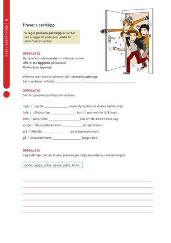 Oppgave 52 Guttene kom stormende inn i klasserommet. Offeret ble liggende på bakken. Rektor kom løpende. Verbene over som er uthevet, står i presens partisipp. Skriv verbene i infinitiv. _______________ _______________ _______________ Oppgave 53 Sett inn presens partisipp av verbene. ligge / Jeg ble ______________ under dyna etter at klokka hadde ringt. hyle / Lillebror løp _______________ bort til mamma for å få trøst. sitte / Aurora ble __________________ selv om de andre reiste seg. synge / Skuespilleren kom ____________ inn på scenen. stå / Alle ble ________________ da kronprinsen kom. gå / Alexander kom _________________ langs veien.