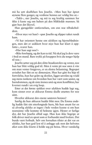 må ha sett skuffelsen hos Josefin. «Men hun har åpnet øynene flere ganger, og verdiene hennes ser veldig bra ut.» «Takk», sier Josefin, og må ta seg kraftig sammen for ikke å kaste seg om halsen på den blåkledde mannen. Så gjør hun det likevel. Han gjengjelder omfavnelsen, om enn noe tilbakeholdent. «Hvor mye vet hun?» spør Josefin og slipper taket rundt ham. «Vi har orientert henne om ulykken og hjerneblødningen, men det er usikkert hvor mye hun har klart å oppfatte», svarer han. «Har hun sagt noe?» «Ikke foreløpig, og det kan ta tid. Nå skal jeg la dere være i fred en stund. Bare trykk på knappen hvis du tenger hjelp til noe.» Josefin setter seg på den slitte besøksstolen og venter, noe hun har blitt veldig god til. Men å vente på noe uten å vite om man venter forgjeves, er en ekstra belastning. Begrepet uvisshet har fått en ny dimensjon. Hun har gått fra håp til fortvilelse, hun har grått og skreket, ligget søvnløs og vridd seg mens tankene om hvordan hun har vært som søster, og barndommen, og de siste årenes små og store konflikter, har kvernet rundt i en evig loop. Etter at det første sjokket over ulykken hadde lagt seg, kom sinnet over at akkurat Emma skulle utsettes for noe sånt. Hvorfor akkurat den eneste søsteren hennes? Særlig da hun akkurat hadde blitt mor. Da Emma endelig hadde fått sitt etterlengtede barn, ble hun utsatt for en så alvorlig ulykke at ingen i hele verden kunne si om hun noensinne ville komme til hektene igjen. Hester er farlige dyr, det har Josefin alltid sagt. Hun kan ikke begripe at folk driver med en sport som er forbundet med livsfare. Det burde vært forbudt. Selv om fornuften tilsier at det var en ulykke, har hun god lyst til å anlegge sak mot det helvetes øket som ikke klarte å holde seg på beina. Hvor vanskelig 22
