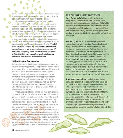 Ulike former for protein All naturlig mat er livgivende, men protein ivaretar en rekke livsviktige oppgaver. Alle proteiner brytes ned til aminosyrer, kjent som livets byggeklosser. All animalsk mat inneholder de åtte essensielle aminosyrene vi trenger til gjenoppbygging og reparasjon. De kan imidlertid virke syredannende i kroppen, noe som det tar flere dager å fordøye, og som ofte råtner på veien gjennom fordøyelsessystemet. Da danner det seg avfallsstoffer som kan være giftige og utmattende, og som kan forårsake oppblåsthet og fordøyelsesproblemer. Vegetariske proteiner finnes i all mat som plantes og vokser til korn, frø, planter eller trær – ofte mange ganger så stort som det opprinnelige frøet. Bare tenk deg solsikkekjernen, som blir til en 2,5–3 meter høy solsikkeblomst – gigantisk i forhold til det lille frøet. Denne maten er mye lettere å fordøye, samtidig som den forsyner hver eneste celle i kroppen med de samme byggeklossene. Det er imidlertid livsviktig at vi kombinerer de ulike vegetariske proteinkildene, slik at vi får i oss alle de åtte essensielle aminosyrene som til sammen bygger opp kroppen vår. Vi kan sammenlikne denne «byggeprosessen» med en samling Lego-klosser og den myriaden av fasonger og gjenstander vi kan bygge med de ulike klossene, fargene og formene. 14 næringsgruppene