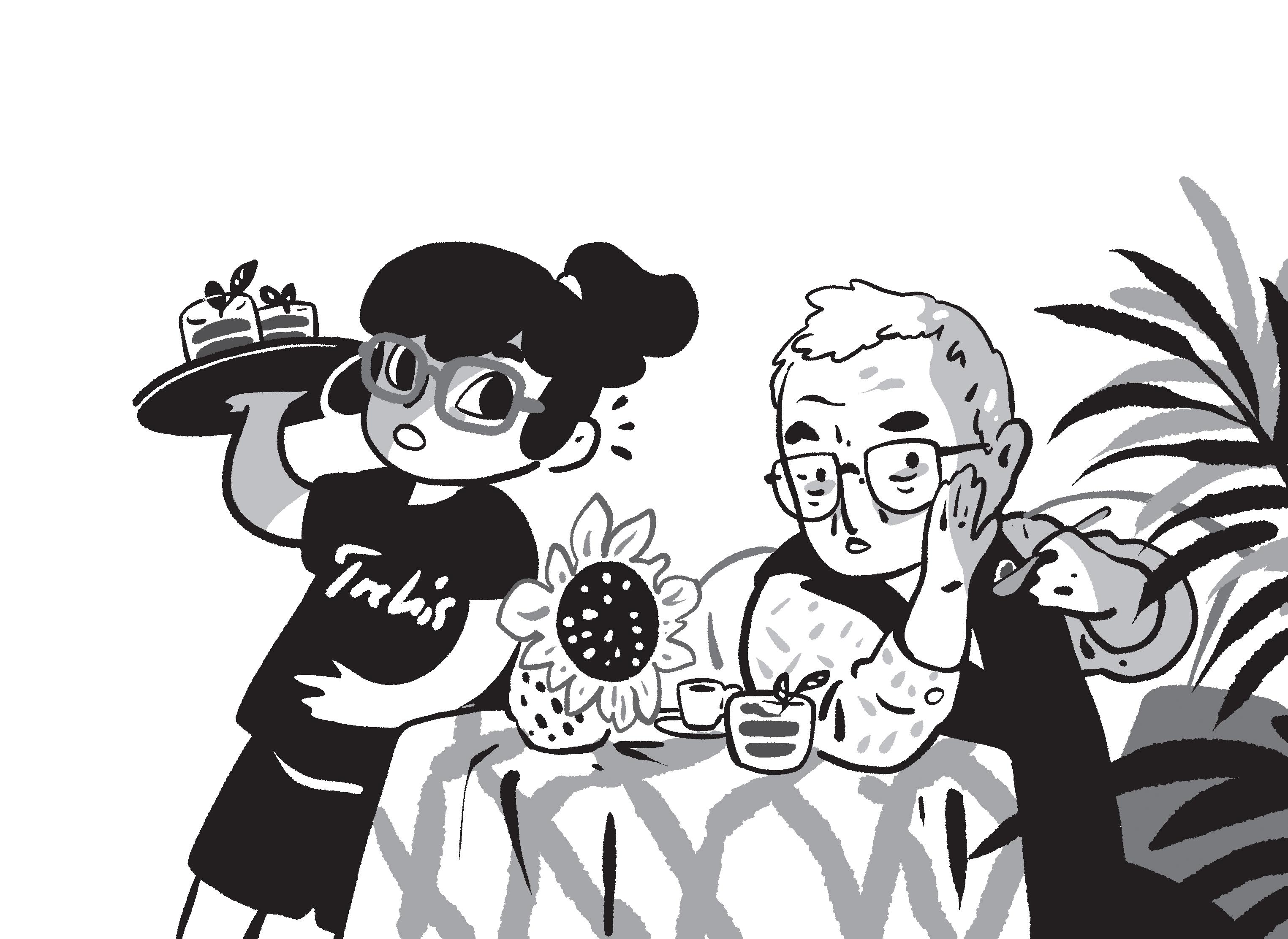 så dyttet du til et bord på uteserveringen så kaffekoppene ristet!
