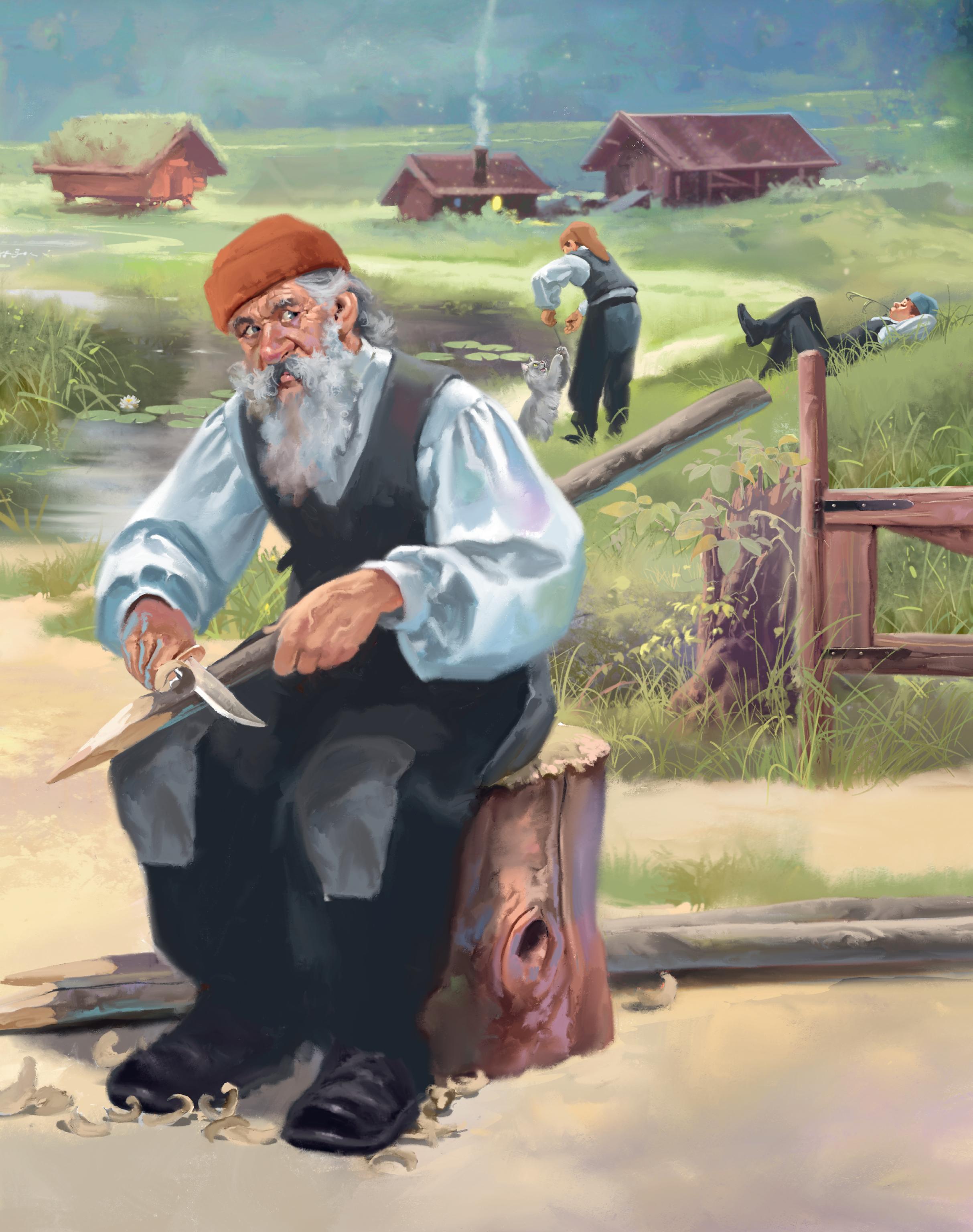 Langt om lenge fikk han dem også med på det, og den eldste skulle ut og hogge først.
