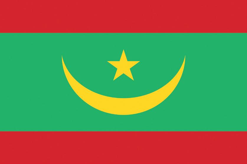 FLAGGFAKTA : Tidligere var dette ett av verdens to nasjonalflagg uten fargene rødt, hvitt eller blått (det andre var Jamaica, se s. 19). Men i 2017 ble de røde stripene lagt til, for å symbolisere motstandskampene i landet. Grønnfargen står for islam, og gulfargen for Saharaørkenen.