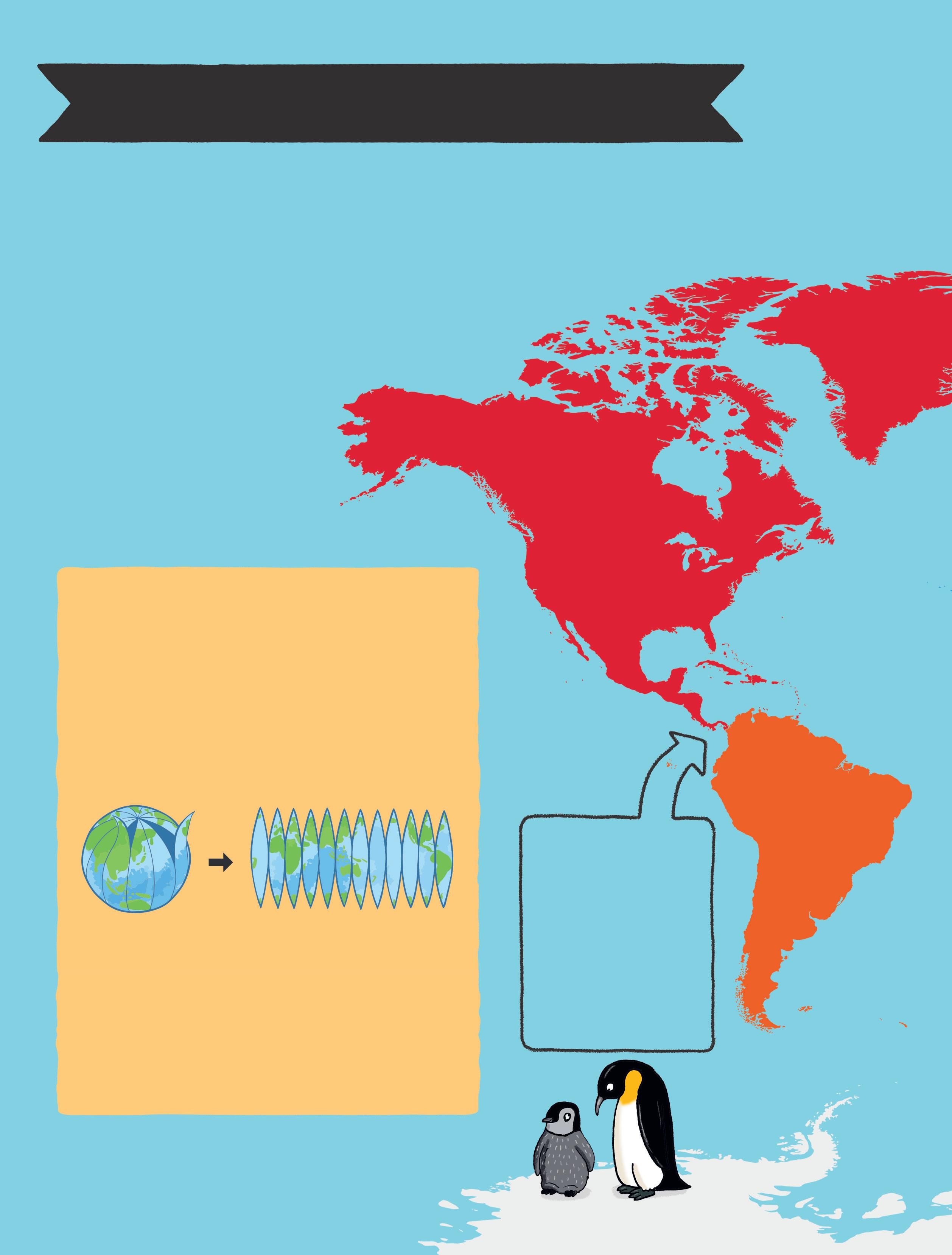 Se for deg at du skreller en globus som en appelsin, og deretter prøver å klemme skrellet flatt. Det dukker opp glipper mellom de ulike bitene. Formen på landmassene må justeres for å fylle glippene.