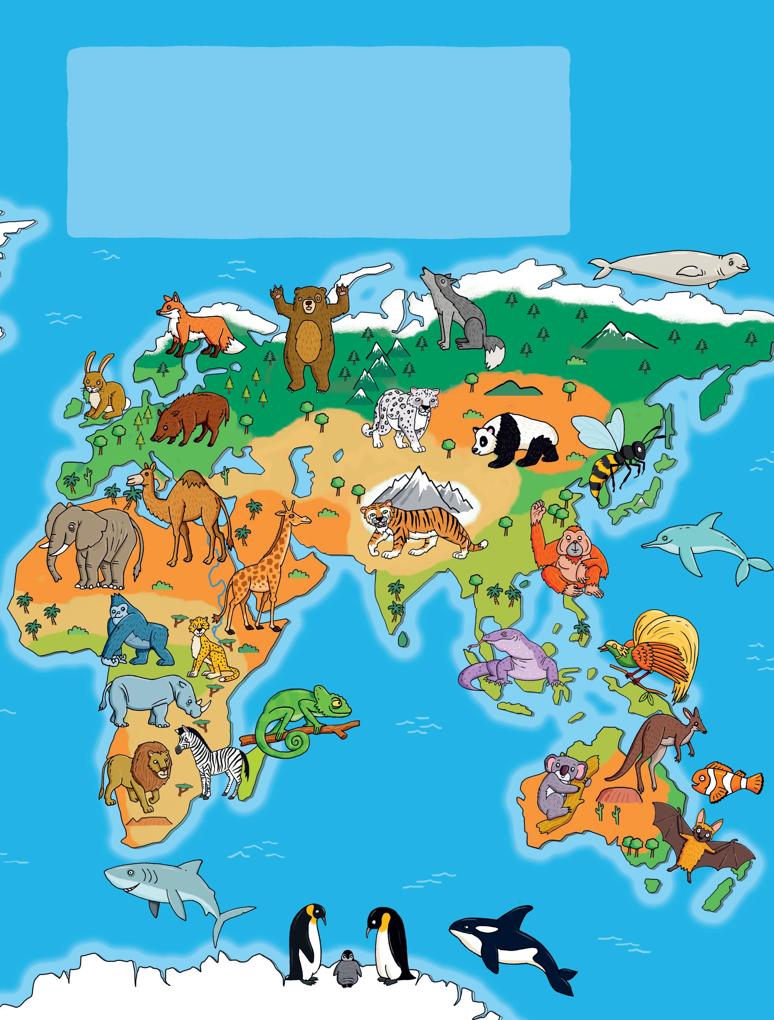 Dette kartet viser hvor noen av verdens mest kjente dyr lever – både på land og i havet.