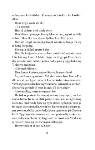 ordnet med kaffe til dem. Rommet var ikke klart før klokken elleve. Hvor lenge skulle de bli? Til i morgen. Hun så på ham med smale øyne. Den lille satt på teppet her og lekte, sa hun, jeg tok et bilde av ham. Han fikk låne denne bjellen. Han likte lyden. Hun slo lett på messingbjellen på skranken, den ga fra seg et lystig lite pling. Får jeg se bildet? spurte Sejer. Hun ble forfjamset, men ga ham mobiltelefonen sin, etter å ha lett seg frem til bildet. Sejer så lenge på Elias. Kanskje det aller siste bildet. Gutten hadde på seg joggebukse og T-skjorte med tekst. «Limited edition». Den damen i heisen, spurte Skarre, hvem er hun? Åh, sa Gossen og rødmet. Vi kaller henne bare Greta. For alle sier at hun ligner sånn på Greta Garbo. Stemmen altså. Vi vil at gjestene skal føle seg velkomne, la hun til, så det båndet står og går helt til noen klager. Vil dere klage? Absolutt ikke, svarte mennene i kor. De fikk opptakene fra resepsjonen og inngangen, var fort innom baren. Kastet et blikk på interiøret, som var i grønt og mahogni, med runde bord og dype stoler, og lamper som ga fra seg et sparsommelig, varmt lys. Deretter gikk de ut på gaten, sto et øyeblikk under baldakinen og så over på Grevens Gård. Bygningen fra nitten elleve var opprinnelig sterkt rosa, men hadde etter hvert fått farge som overkokt laks. Vinduene var relativt små, og det var ingen balkonger. Hvert vindu er et øye, sa Sejer. 25