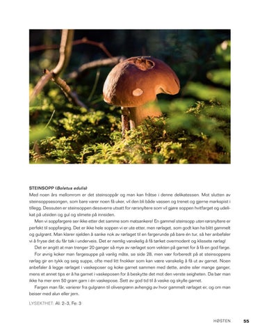 Med noen års mellomrom er det steinsoppår og man kan fråtse i denne delikatessen. Mot slutten av steinsoppsesongen, som bare varer noen få uker, vil den bli både vassen og trenet og gjerne markspist i tillegg. Dessuten er steinsoppen dessverre utsatt for rørsnyltere som vil gjøre soppen hvitfarget og udeli kat på utsiden og gul og slimete på innsiden. Men vi soppfargere ser ikke etter det samme som matsankere! En gammel steinsopp uten rørsnyltere er perfekt til soppfarging. Det er ikke hele soppen vi er ute etter, men rørlaget, som godt kan ha blitt gammelt og gulgrønt. Man klarer sjelden å sanke nok av rørlaget til en fargerunde på bare én tur, så her anbefaler vi å fryse det du får tak i underveis. Det er nemlig vanskelig å få tørket overmodent og klissete rørlag! Det er angitt at man trenger 20 ganger så mye av rørlaget som vekten på garnet for å få en god farge. For øvrig koker man fargesuppe på vanlig måte, se side 28, men vær forberedt på at steinsoppens rørlag gir en tykk og seig suppe, ofte med litt fnokker som kan være vanskelig å få ut av garnet. Noen anbefaler å legge rørlaget i vaskeposer og koke garnet sammen med dette, andre siler mange ganger, mens et annet tips er å ha garnet i vaskeposen for å beskytte det mot den verste seigheten. Da bør man ikke ha mer enn 50 gram garn i én vaskepose. Sett av god tid til å vaske og skylle garnet. Fargen man får, varierer fra gulgrønn til olivengrønn avhengig av hvor gammelt rørlaget er, og om man beiser med alun eller jern. LYSEKTHET: Al: 2–3, Fe: 3