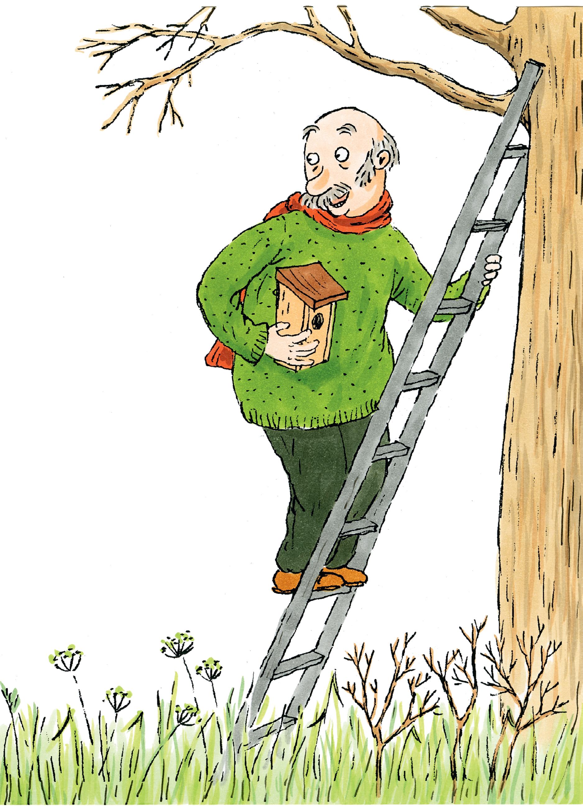 – Jeg har laget en fuglekasse, sier farfar. – Den skal henge her. Da kan vi se den fra vinduet.
