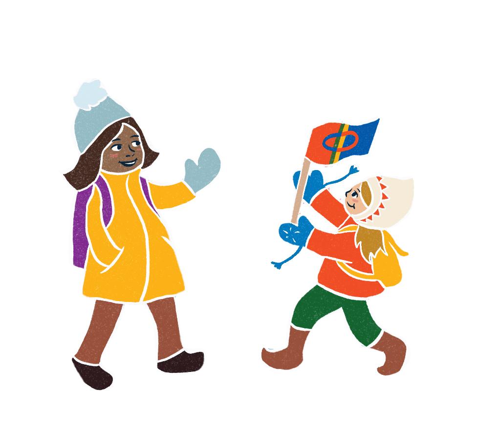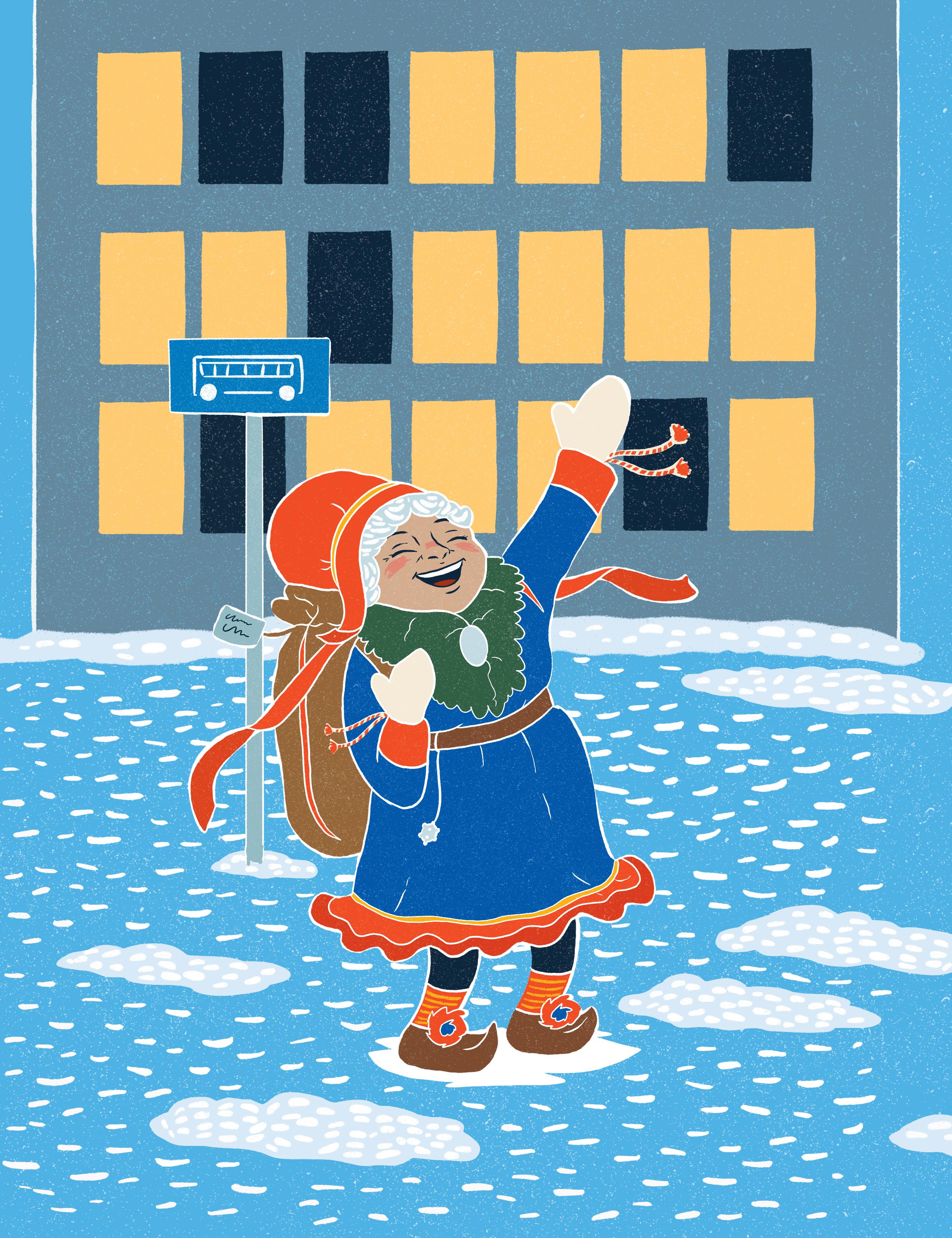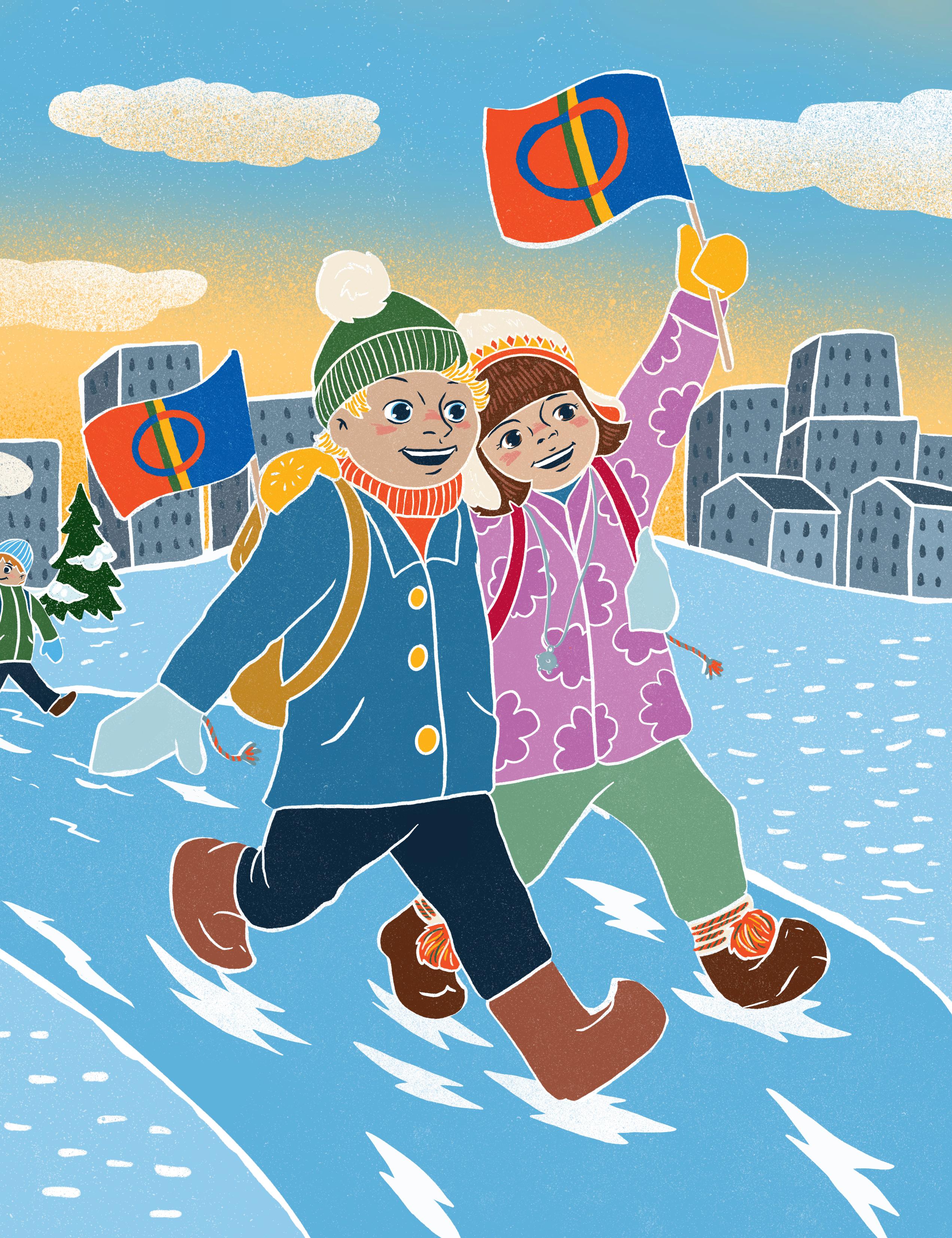 I hele dag har Ole og Hannah feiret samenes nasjonaldag på skolen. Nå gleder de seg til resten av festen! Ole skynder seg mot bussholdeplassen.
