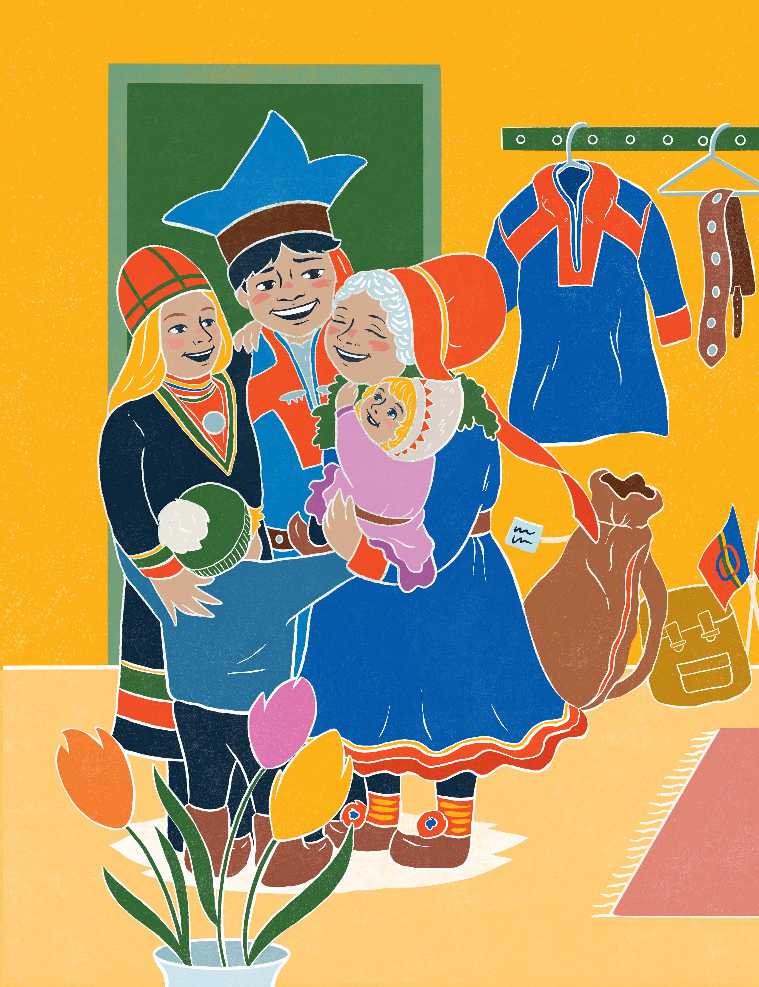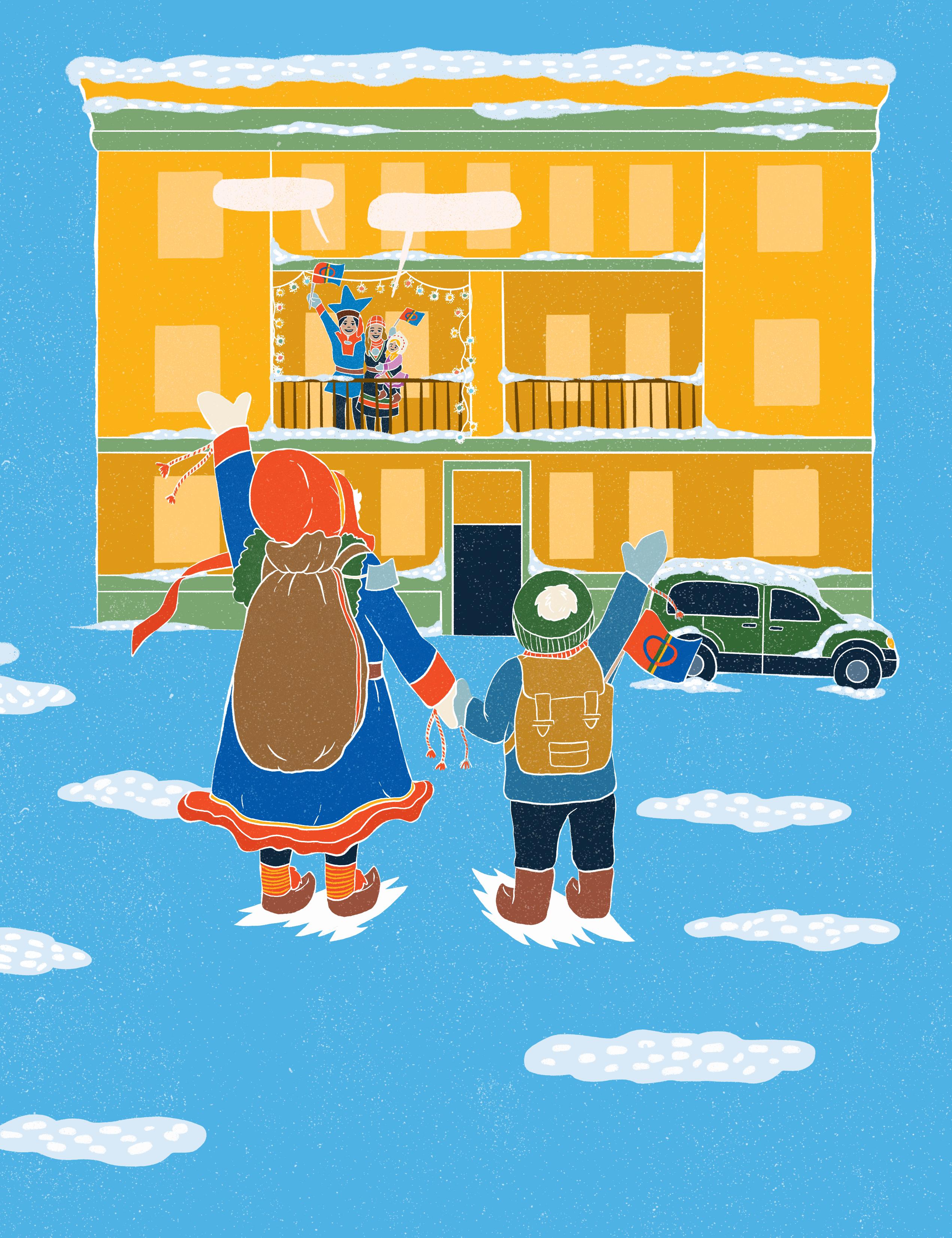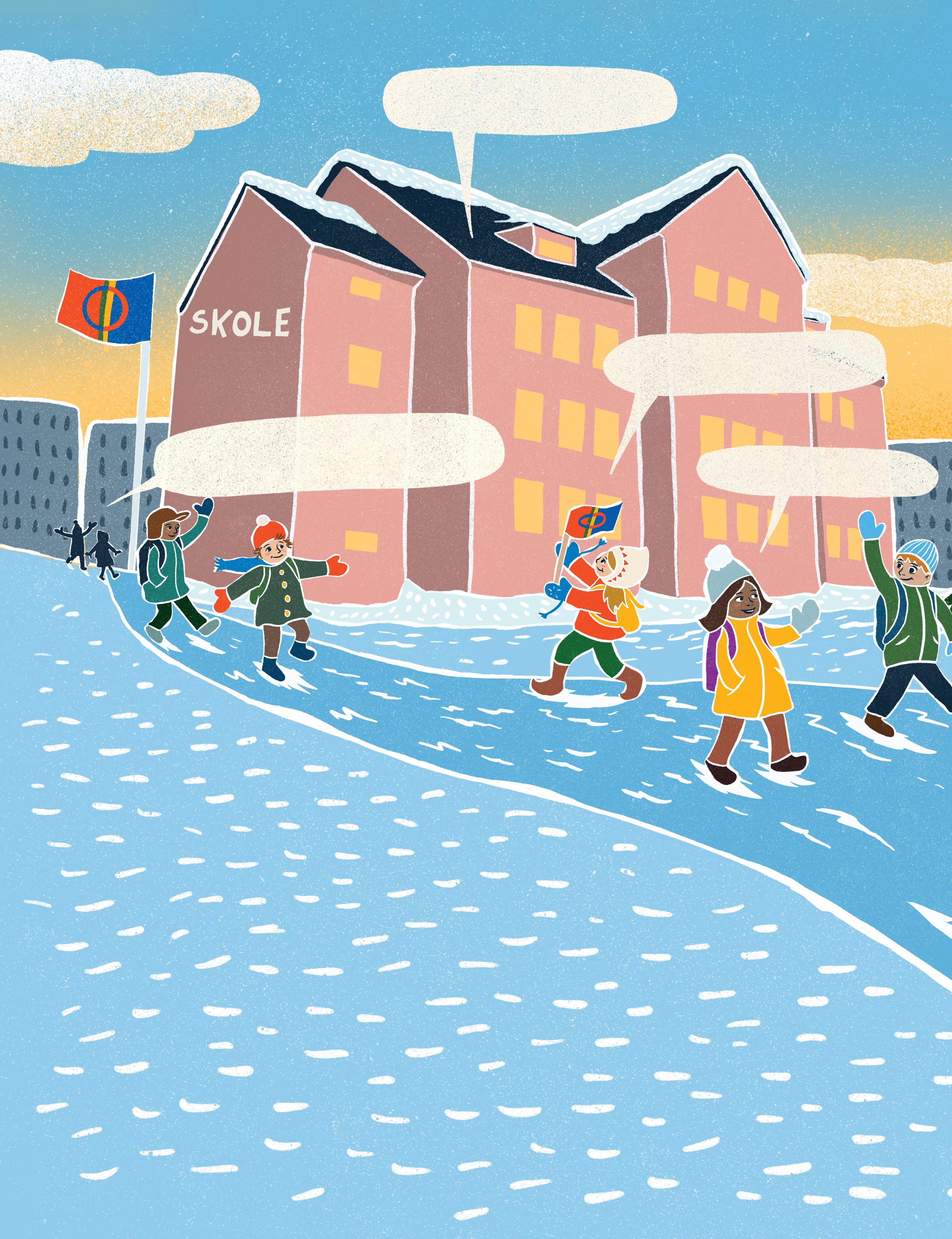 I hele dag har Ole og Hannah feiret samenes nasjonaldag på skolen. Nå gleder de seg til resten av festen! Ole skynder seg mot bussholdeplassen.