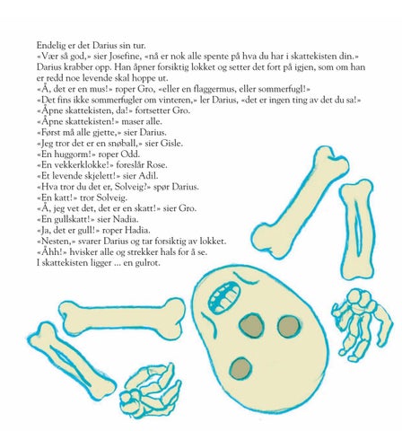 Endelig passe påer atdet du får Darius sittesin sammen tur. med Rose og Gro.» «Vær Adil sukker. så god,» Ersier detJosefine, så vanskelig «nå åersvare nok alle på hva spente kjærlighet på hva er duathar deti skattekisten trengs en heldin.» tur Darius for å snakke krabber omopp. det!Han åpner forsiktig lokket og setter det fort på igjen, som om han er redd noe levende skal hoppe ut. «Å, «Kandet duerramse en mus!» opp alt roper i turkassen Gro, «eller sammen en flaggermus, med Solveig,» eller sommerfugl!» ber Sally, «så vi vet om vi «Det har husket fins ikke alt,sommerfugler og hun får øvd ompåvinteren,» ordene enlergang Darius, til?»«det er ingen ting av det du sa!» «Åpne Med ordskattekisten, og tegn ramser da!»Adil fortsetter og Solveig Gro. opp vedkubber til bålet, brød, grønnsaksbiter «Åpne til lapskaus, skattekisten!» plaster, kakao maserogalle. mye annet. «Hvor er Lille Sorte Gryte?» spør Adil. «Jeg «Først visste vi måhadde alle gjette,» glemt noe,» sier Darius. sier Josefine og skynder seg til spiskammeret for å hente «Jeg bålgryta. tror det «Såerklart en snøball,» Lille Sorte sier Gryte Gisle. må være med!» «En «Ellers huggorm!» blir den sjalugæren, roper Odd. sier Adil. «En vekkerklokke!» foreslår Rose. «Et «Hvor levende har duskjelett!» lært det sier ordet?» Adil.ler Josefine. «Hun som bor under oss, sier at noen gangertror blirdu hann hennesspør sjaluDarius. gæren når hun snakker med noen andre, og da «Hva detkatten er, Solveig?» «En går den katt!» sin tror vei og Solveig. blir borte i mange dager,» «Å, jeg vet det, det er en svarer skatt!» Adil. sier Gro. «En «Huttetu gullskatt!»for sier hannkatt!» Nadia. «Ja, sier Sally. det er gull!» roper Hadia. «Nesten,» «Men når han svarer kommer Darius tilbake, og tar forsiktig er alt bra avigjen,» lokket. «Åhh!» sier Adil.hvisker alle og strekker hals for å se. I«Det skattekisten er nok kjærlighet, ligger ... enAdil,» gulrot. smiler Josefine.
