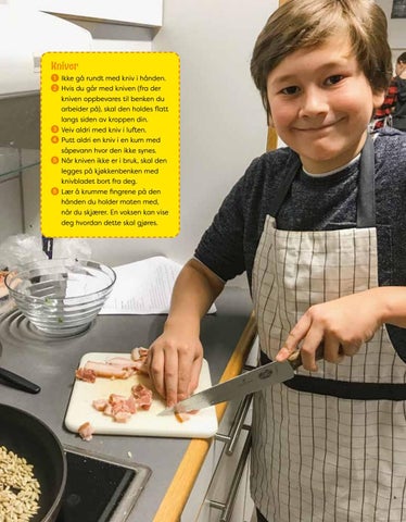 Kniver 1. Ikke gå rundt med kniv i hånden. 2. Hvis du går med kniven (fra der kniven oppbevares til benken du arbeider på), skal den holdes flatt langs siden av kroppen din. 3. Veiv aldri med kniv i luften. 4. Putt aldri en kniv i en kum med såpevann hvor den ikke synes. 5. Når kniven ikke er i bruk, skal den legges på kjøkkenbenken med knivbladet bort fra deg. 6. Lær å krumme fingrene på den hånden du holder maten med, når du skjærer. En voksen kan vise deg hvordan dette skal gjøres.