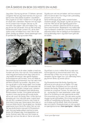 Om å skrive en bok og miste en hund Jeg sitter i Surrey og skriver. I Cobham, sørvest i England. Her bor jeg med mannen min og to av barna mine. Den eldste studerer i Trondheim. Den yngste er 13. Han i midten er 17. De går på en skole rett i nærheten. Mannen min tar toget inn til London hver morgen. Det tar ca. 45 minutter. Han jobber i det som kalles City – og jeg skriver her på landet. Hvis du fikk med deg landeveisrittet under London-OL, så du dem sykle rundt i området hvor vi bor. Her er det grønt, landlig og vakkert. Store eikeskoger som er perfekt for meg og hunden Milla.