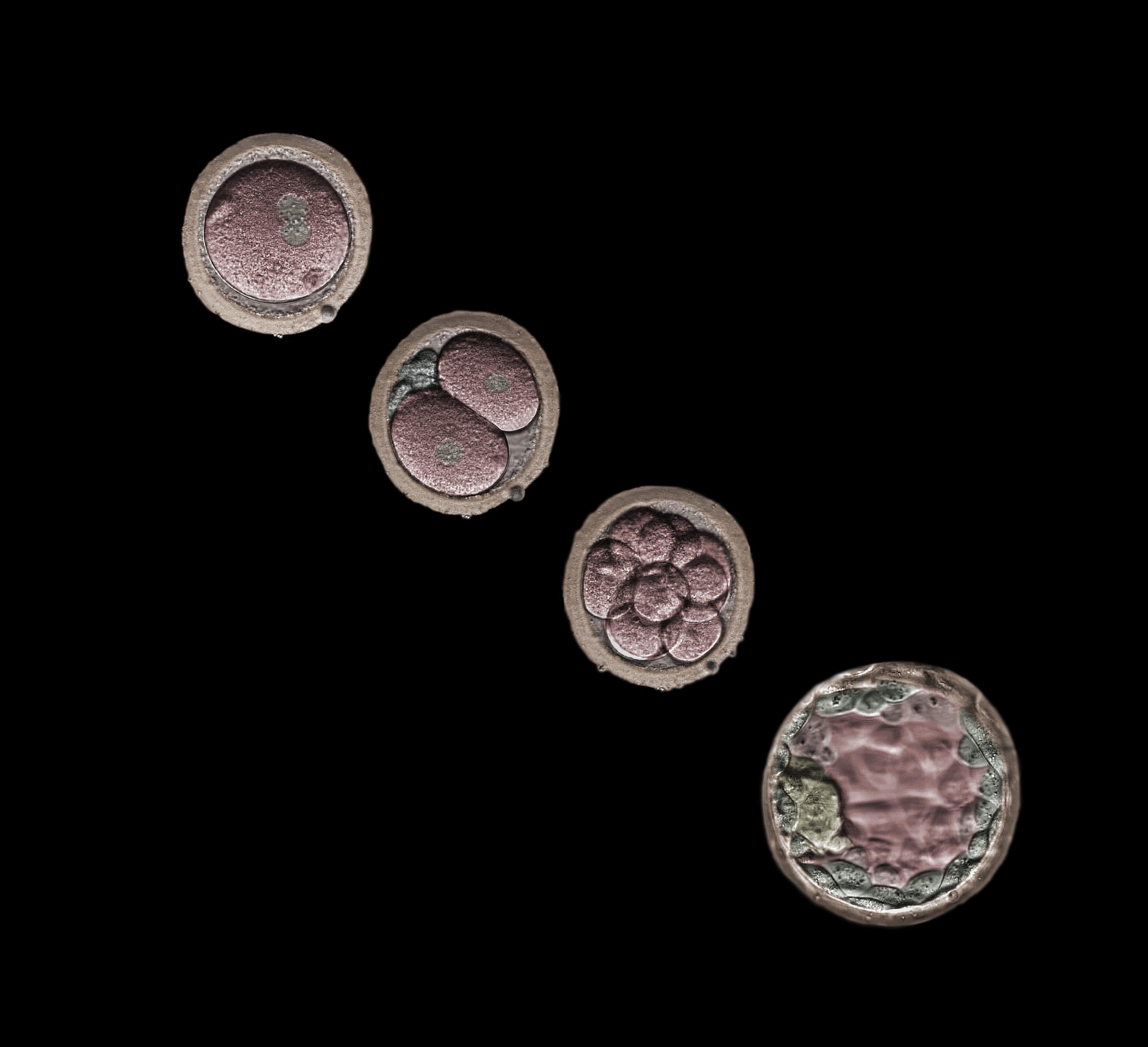 Befruktet eggcelle og en sædcelle – forstørret 1200 ganger. Sædcellen slipper ikke inn i eggcellen fordi den allerede er befruktet av en annen sædcelle. De to runde områdene inne i egget er arvestoffet fra mor og far, som skal kopieres og fordeles når cellen begynner å dele seg.
