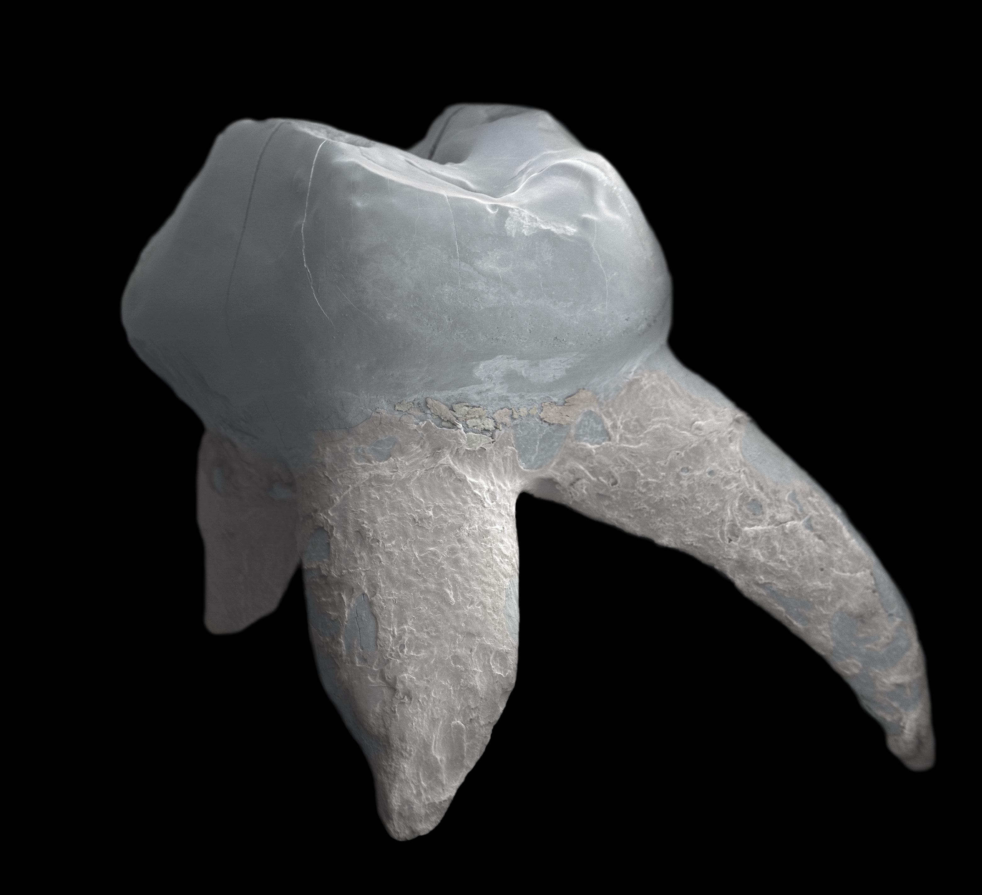 Melketann – forstørret 25 ganger. De små sprekkene i tannen er ikke hull, men slitasje. Melketenner har tynnere emalje enn voksentenner og kan derfor lettere få slike sprekker. ►