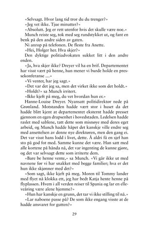 «Selvsagt. Hvor lang tid tror du du trenger?» «Jeg vet ikke. Tjue minutter?» «Absolutt. Jeg er rett utenfor hvis det skulle være noe.» Munch reiste seg, tok med seg rundstykket ut, og fant en benk på den andre siden av gaten. Ni anrop på telefonen. De fleste fra Anette. «Hei, Holger her. Hva skjer?» Den dyktige politiadvokaten sukket litt i den andre enden. «Ja, hva skjer ikke? Dreyer vil ha en brif. Departementet har visst vært på henne, hun mener vi burde holde en pressekonferanse …» «Vi venter, har jeg sagt.» «Det var det jeg sa, men det virket ikke som det holdt.» «Holdt?» sa Munch irritert. «Ikke kjeft på meg, du vet hvordan hun er.» Hanne-Louise Dreyer. Nyansatt politidirektør nede på Grønland. Motstanden hadde vært stor i huset da det hadde blitt kjent at departementet eksternt hadde presset gjennom en egen drapsenhet i hovedstaden. Ledelsen hadde raslet med sablene, tatt dette som misnøye med deres eget arbeid, og Munch hadde håpet det kanskje ville endre seg med ansettelsen av denne nye direktøren, men den gang ei. Det var visst hans lodd i livet, dette. Å aldri få en sjef han sto på god fot med. Samme kunne det være. Han satt med alle kortene på hånda nå, det var ingenting de kunne gjøre, og det var selvsagt dette som irriterte dem. «Bare be henne vente,» sa Munch. «Vi går ikke ut med navnene før vi har snakket med begge familier; hva er det hun ikke skjønner med det?» «Som sagt, ikke kjeft på meg. Moren til Tommy lander med flyet nå klokka ett, jeg har bedt Katja hente henne på flyplassen. Hvem i all verden reiser til Spania og lar en elleveåring være alene hjemme?» «Hun har kanskje en grunn, det tar vi ikke stilling til nå.» «Lar naboene passe på? De som ikke engang visste at de hadde ansvaret for gutten?» 29