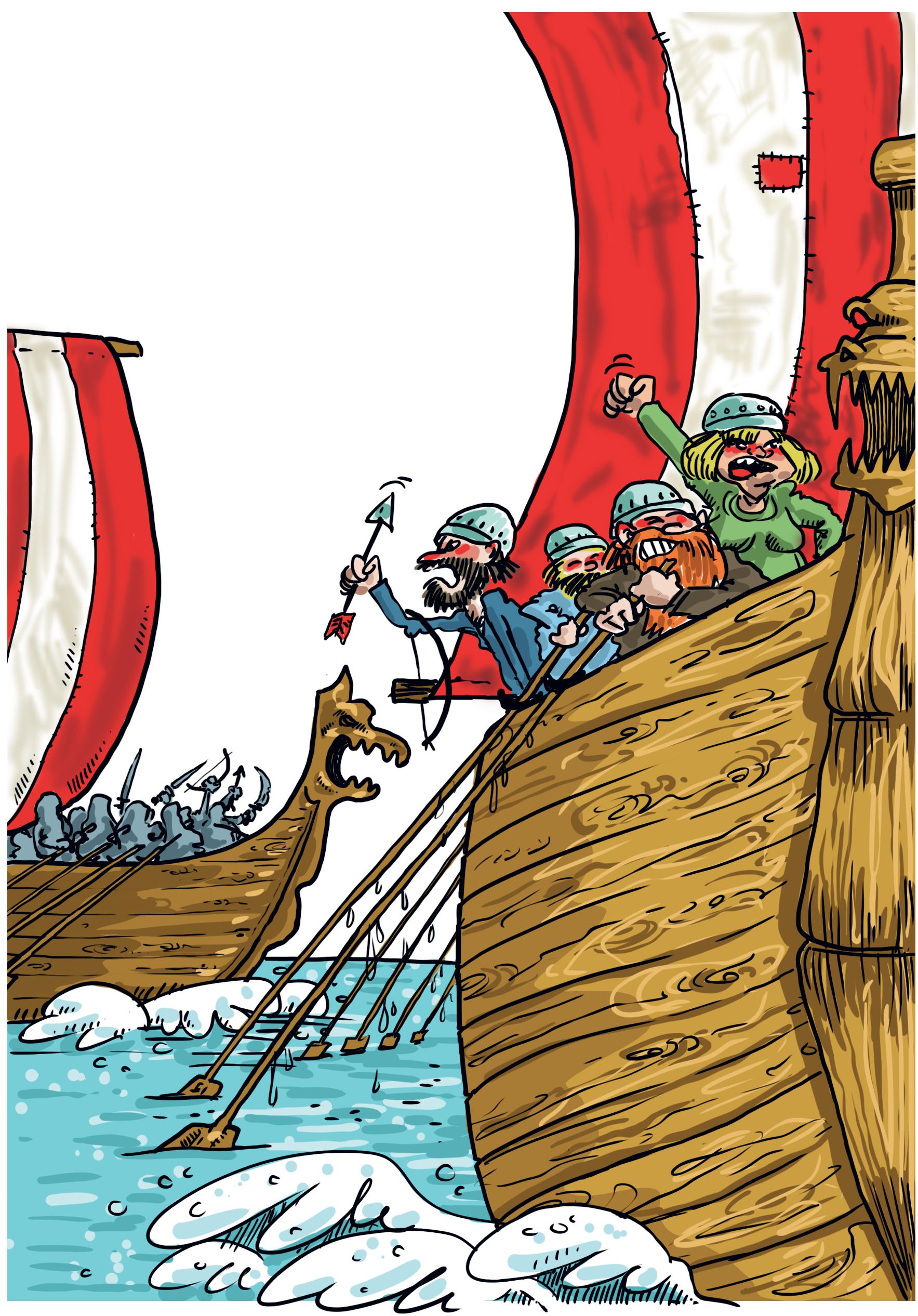 Vikingene er uredde sjøfolk og verdensmestre til å bygge bra båter. De bygger dem av eik, og stapper saueull mellom plankene for å tette. I de største skipene er det plass til 150 menn. For å snekre dem sammen, trengs det over 5000 spiker. Det blir 25 kilo med jern. Like mye som en åtte-åring veier. Likevel er skipene så lette at de kan seiles inn i grunne elver og trekkes opp på land. Hvor som helst. De trenger ikke havner. Det passer bra når man vil komme på overraskende besøk.