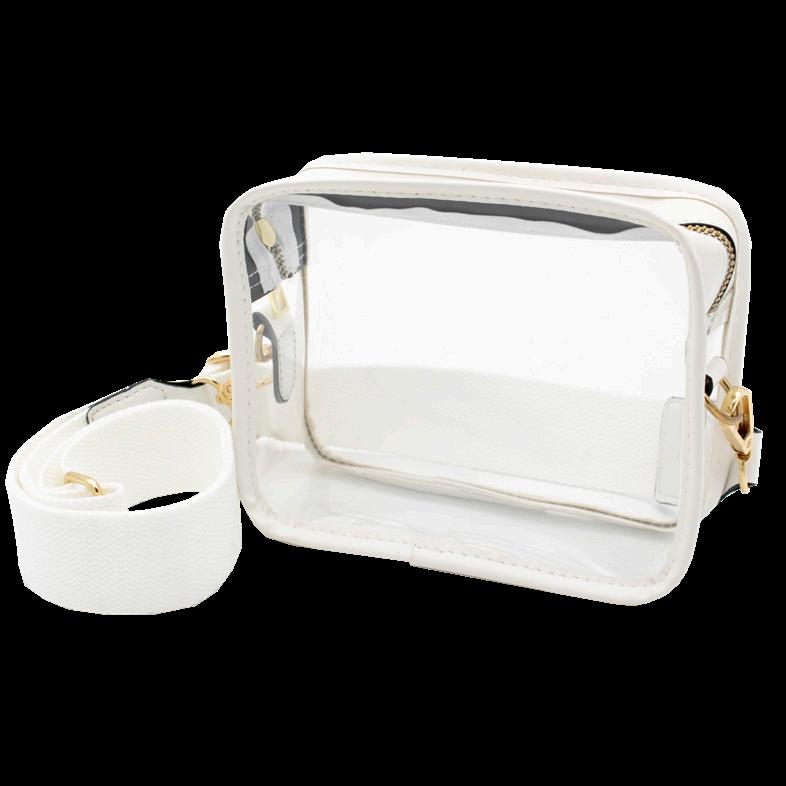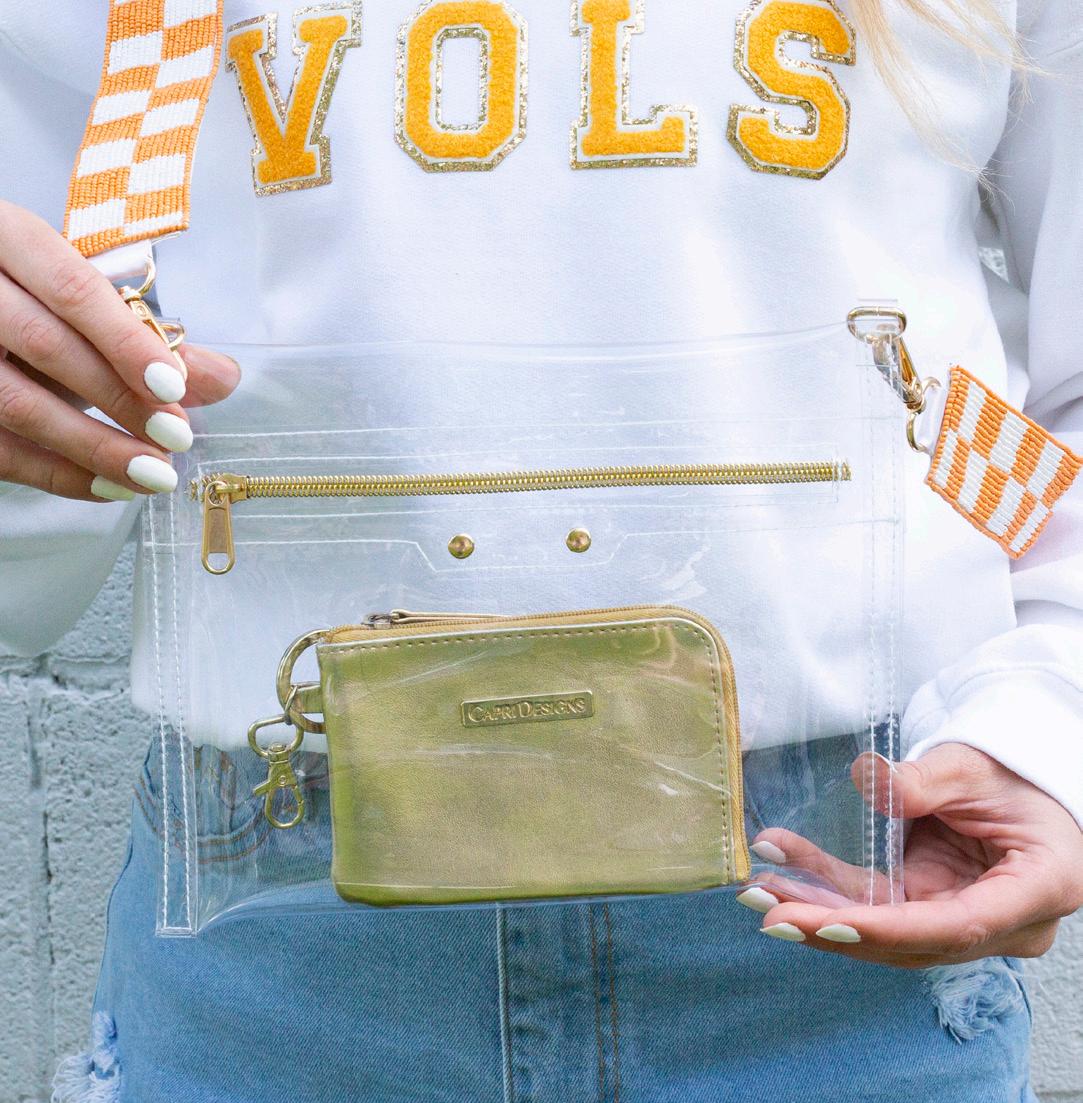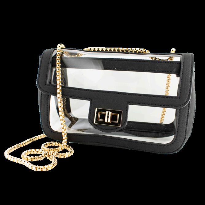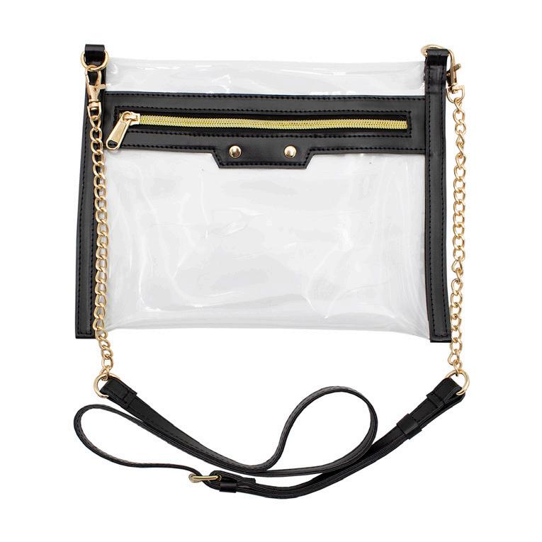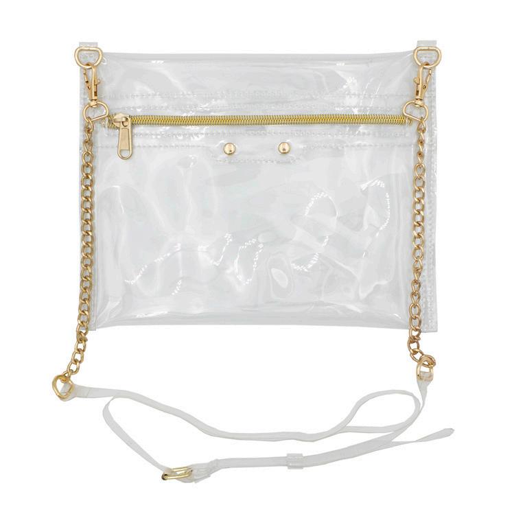 Enjoy this slimmer silhouette with our new Front Zippered Flat Crossbody. Our stadium compliant crossbody features a clear PVC body with gold hardware accents and a beautifully timeless accent chain and coordinating trimmed strap. The main zippered compartment featuring an front zipper design offers secure storage for your personal items. Pairs perfectly with our interchangable straps for added style.