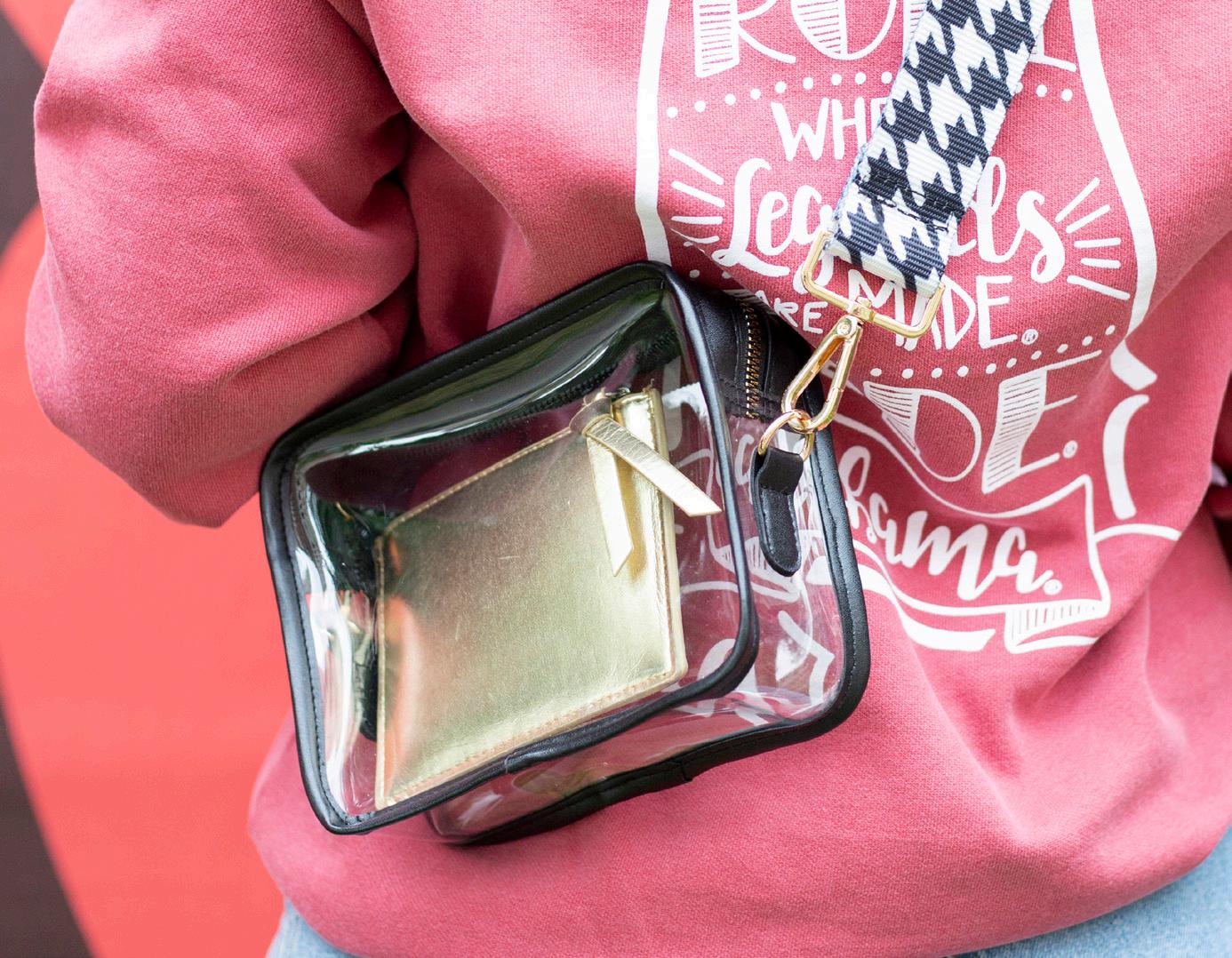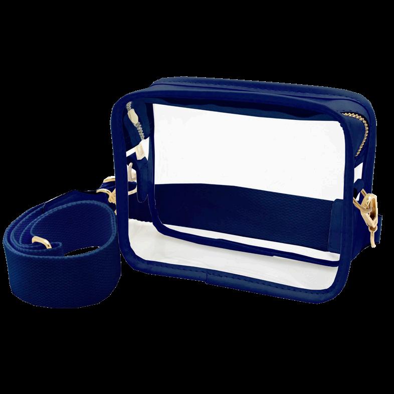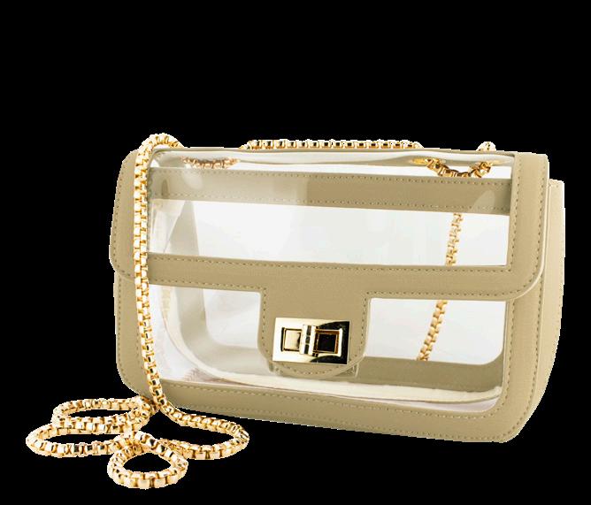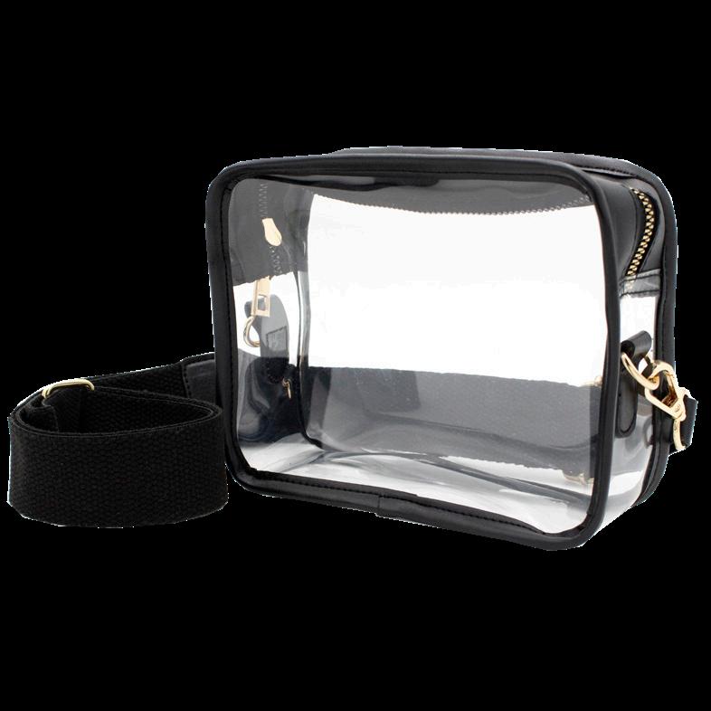 Enjoy this slimmer silhouette with our new Front Zippered Flat Crossbody. Our stadium compliant crossbody features a clear PVC body with gold hardware accents and a beautifully timeless accent chain and coordinating trimmed strap. The main zippered compartment featuring an front zipper design offers secure storage for your personal items. Pairs perfectly with our interchangable straps for added style.