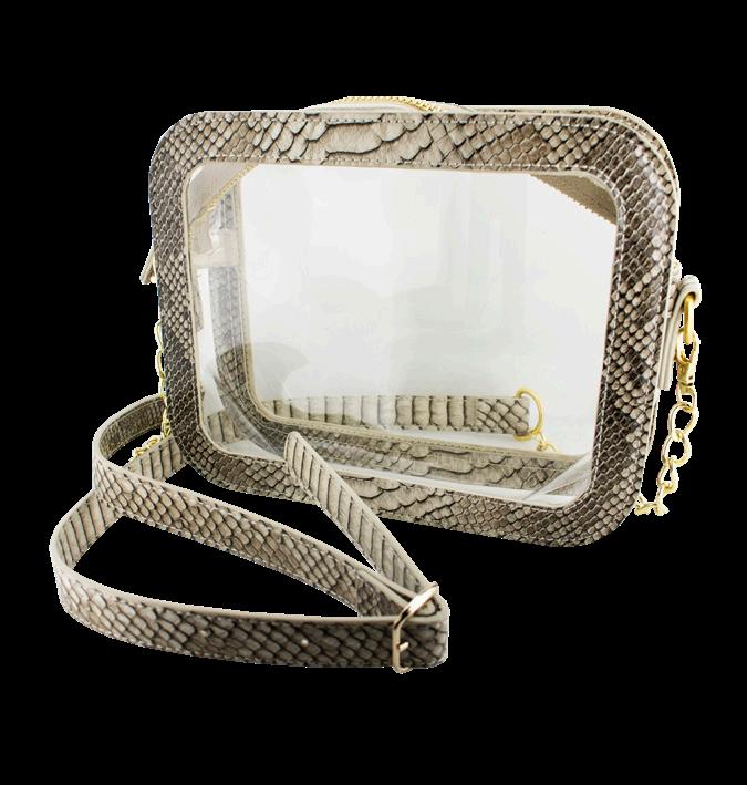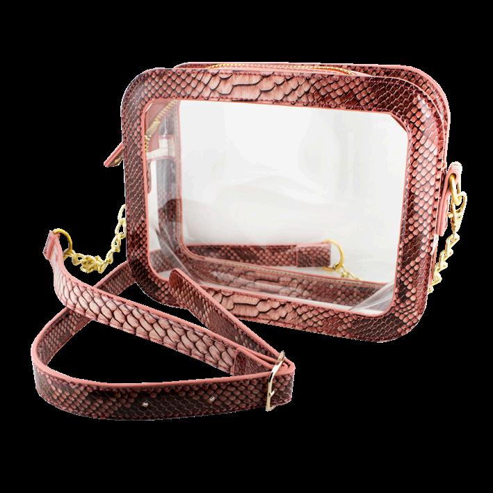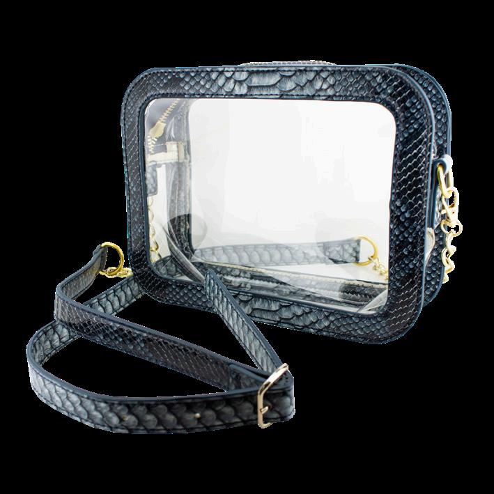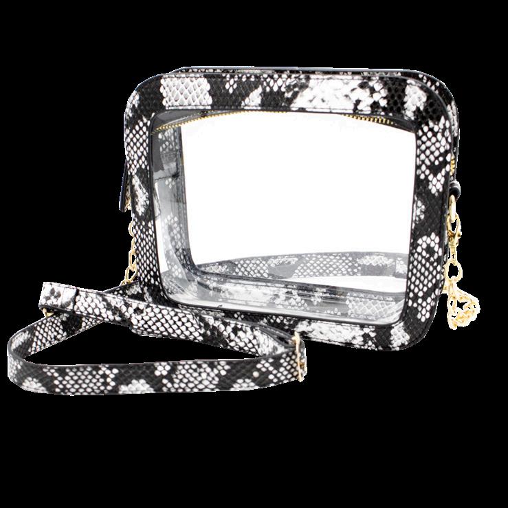 Create a look of iconic style with our Camera Crossbody. This security compliant crossbody features a clear PVC body with gold hardware and beautiful faux snake skin accents. The main zippered compartment is perfect for securely storing your personal items. The matching snake skin accent and gold chain strap complement the classic design.