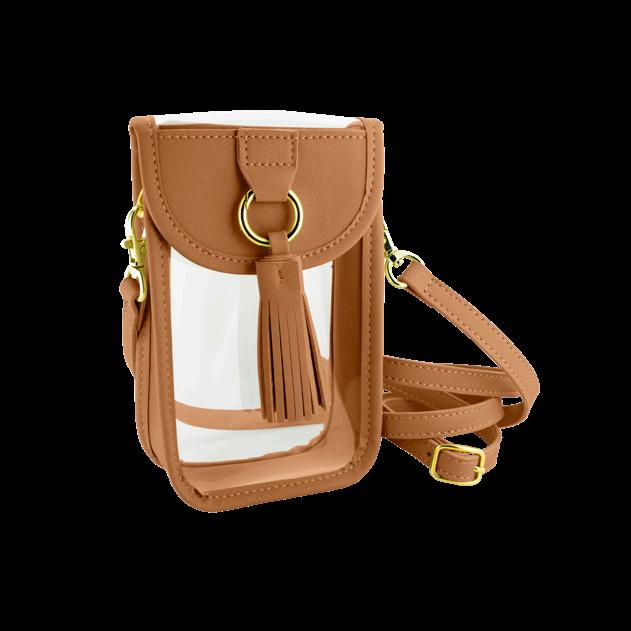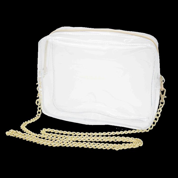Create a look of iconic style with our all clear Camera Crossbody. Our stadium compliant crossbody features a clear PVC body with gold hardware accents and a beautifully timeless accent chain. The main zippered compartment offers secure storage for your personal items. Pairs perfectly with our interchangable straps for added style.