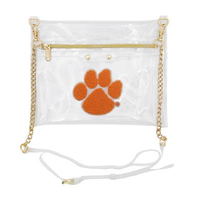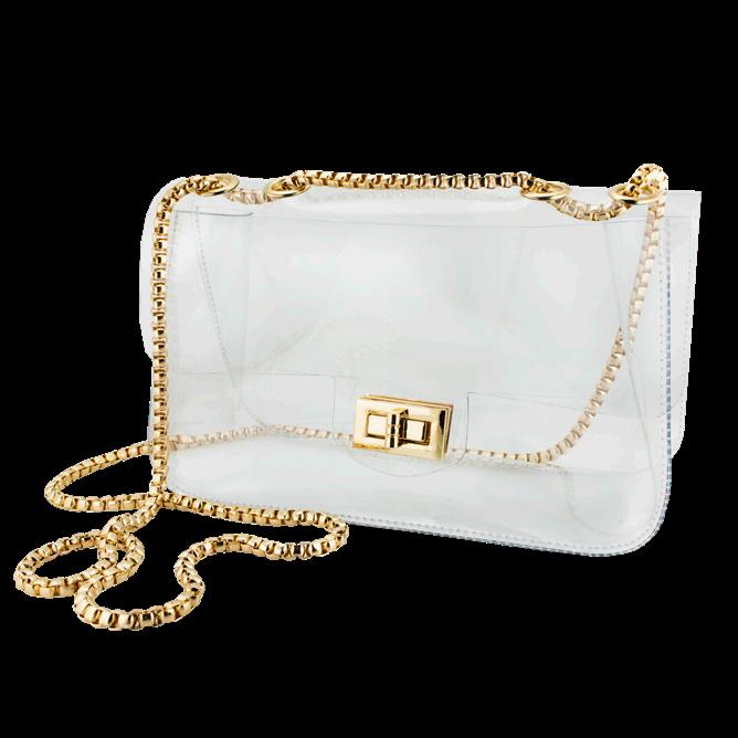 Our stadium compliant crossbody features a clear PVC body with your choice of gold or silver hardware accents and a beautifully timeless accent chain. The main compartment featuring a classic envelope construction includes a turn lock closure for securing your personal items within. Pairs perfectly with our interchangable straps for added style.