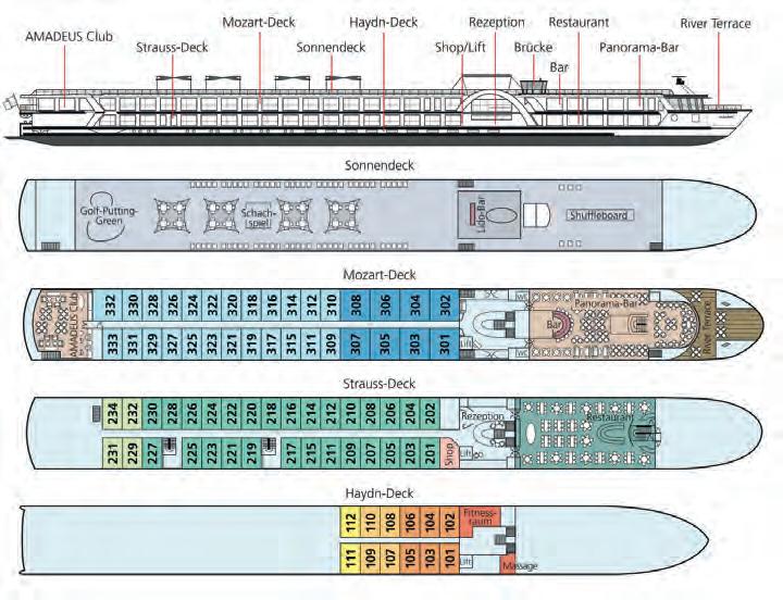 Die MS AMADEUS Nova (Baujahr 2024) ist eines der modernsten und elegantesten Flussschiffe Europas. Freuen Sie sich auf grosszügige Kabinen, ein stilvolles Panorama-Restaurant, ein Café Vienna, eine Lido Bar auf dem Sonnendeck und modernste Antriebstechnologie. Alle Details zur Ausstattung und Deckpläne auf Seite 40.
