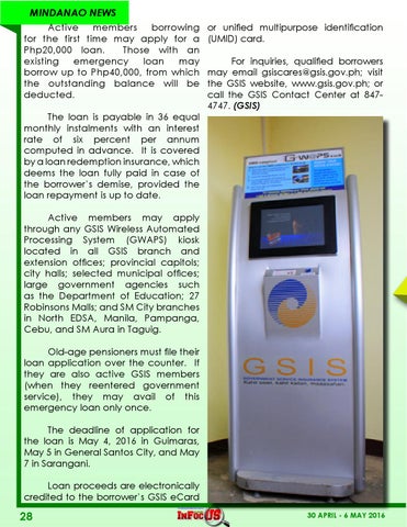 Active members may apply through any GSIS Wireless Automated Processing System (GWAPS) kiosk located in all GSIS branch and extension offices; provincial capitols; city halls; selected municipal offices; large government agencies such as the Department of Education; 27 Robinsons Malls; and SM City branches in North EDSA, Manila, Pampanga, Cebu, and SM Aura in Taguig. Old-age pensioners must file their loan application over the counter. If they are also active GSIS members (when they reentered government service), they may avail of this emergency loan only once. The deadline of application for the loan is May 4, 2016 in Guimaras, May 5 in General Santos City, and May 7 in Sarangani. Loan proceeds are electronically credited to the borrower’s GSIS eCard