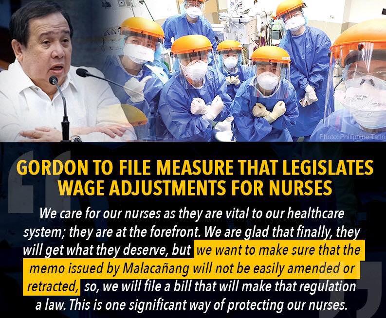 “We care for our nurses as they are vital to our healthcare system; they are at the forefront. We are glad that finally, they will get what they deserve, but we want to make sure that the memo issued by Malacañang will not be easily amended or retracted, so, we will file a bill that will make that regulation a law. This is one significant way of protecting our nurses,” said Gordon.