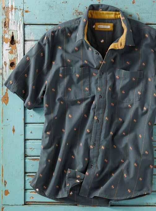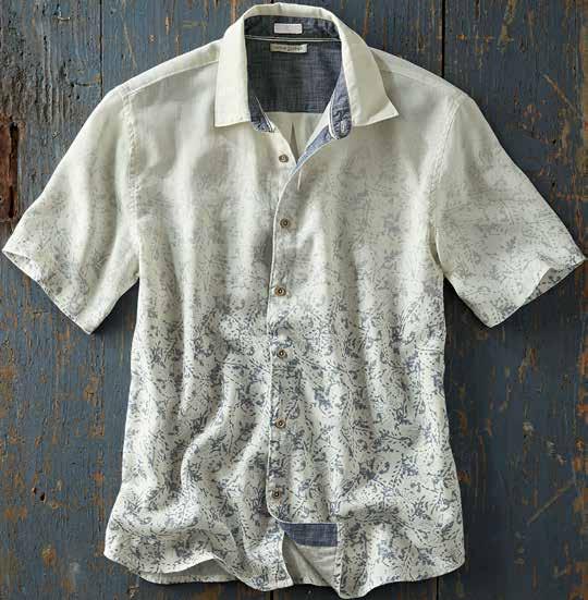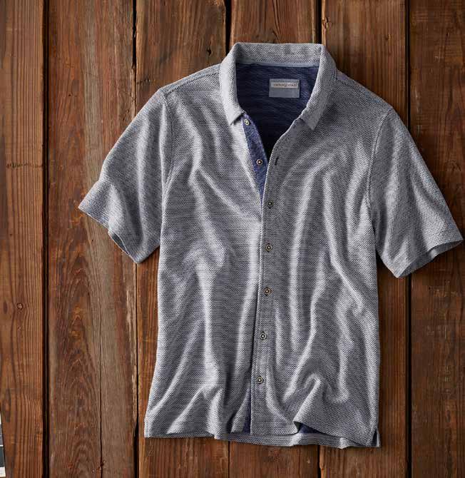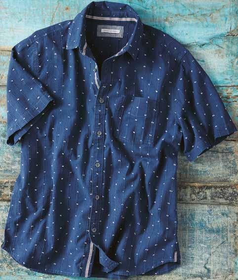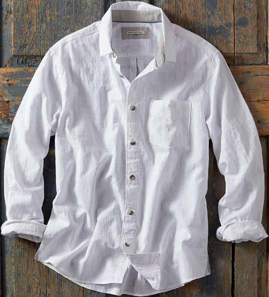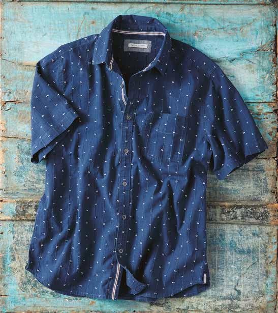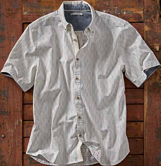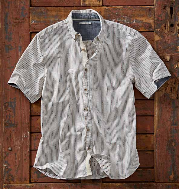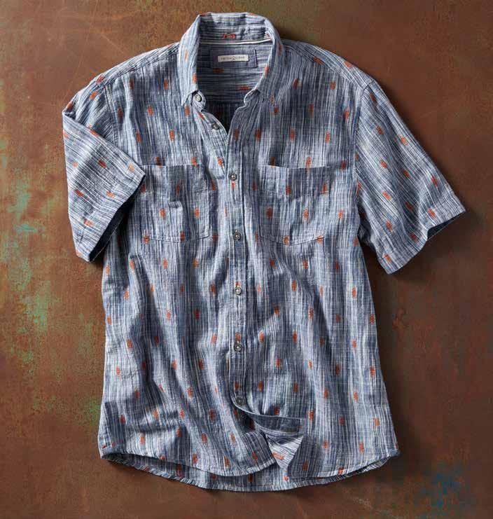 Super-soft, featherweight cotton dobby gives this shirt a laidback, breezy feel warmest days. Tonal geometric pattern and contrast fabric trim at the inner collar, inner back yoke, and side seam hem add interest. 100% cotton. Imported in Salt. Men’s sizes: S-XXL. [133797] $89