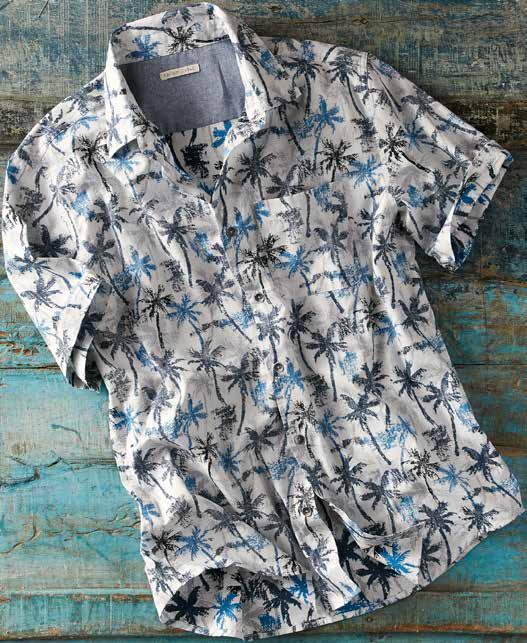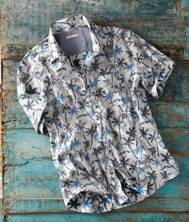Dappled Palms Shirt Evoking palm tree filtered sunlight; this short sleeve print shirt will get you in a vacation mood. The slub poplin texture of the fabric deconstructs the pattern to give it an abstract look. Chambray lining at the inner back yoke. Metal buttons. 100% cotton. Imported in Multi. Men’s Sizes: S-XXL. [133734] $79