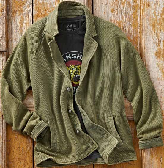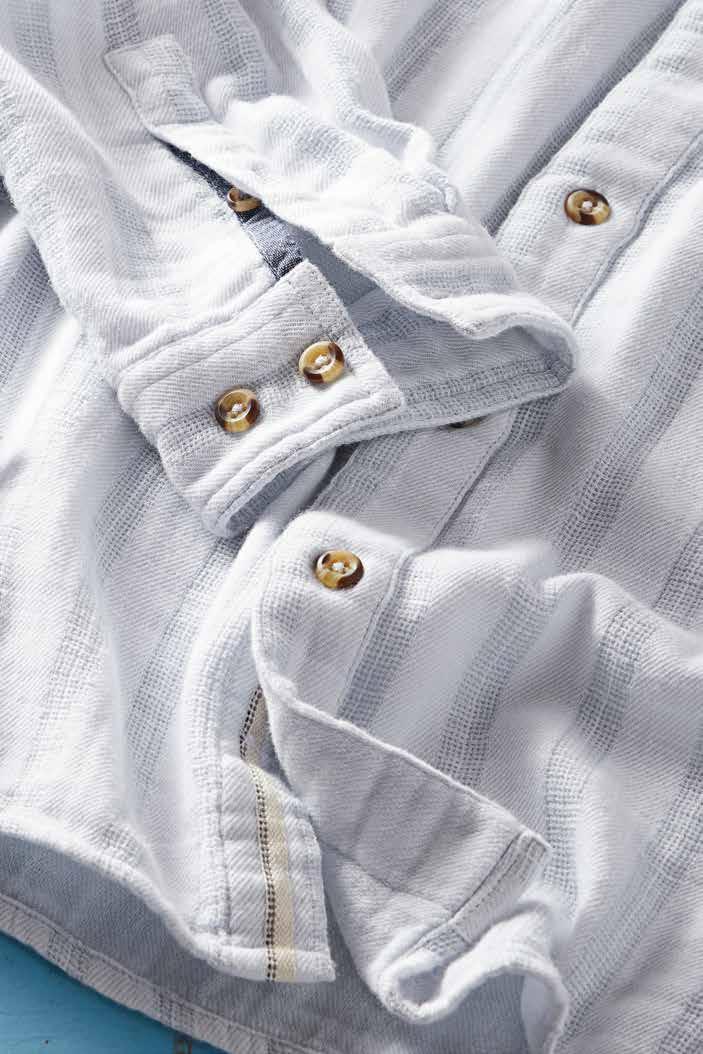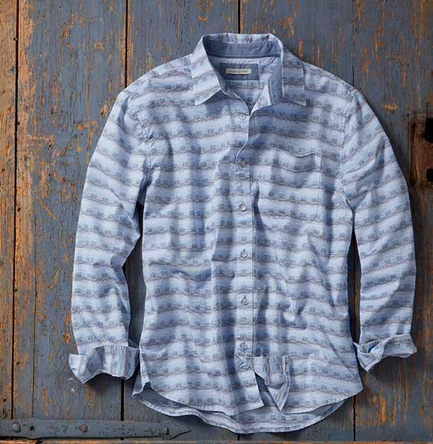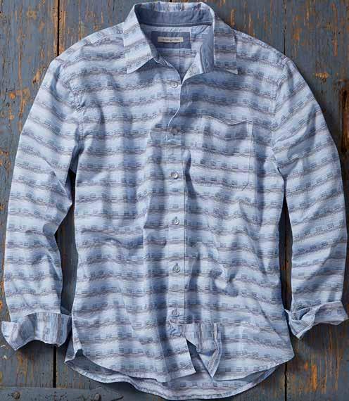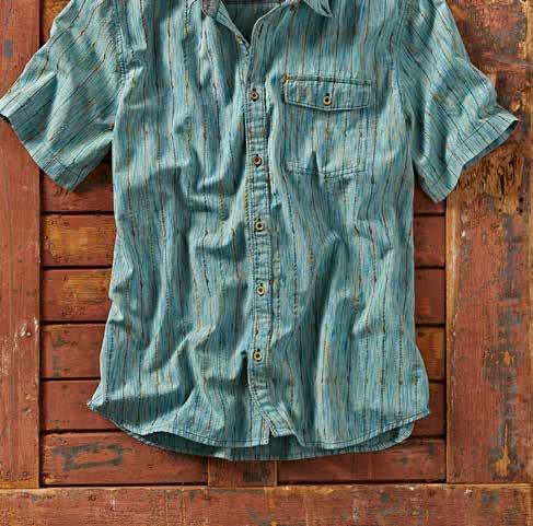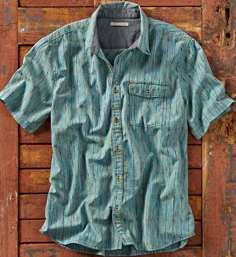The textured weave channels the breeze, making it perfect for warming temps. Chambray trim at inner yoke, inner sleeve cuff, and as a back yoke locker loop. Metal buttons. 100% cotton. Imported in Aqua, Spice or Blue. Men’s sizes: S-XXL. [133800] $89