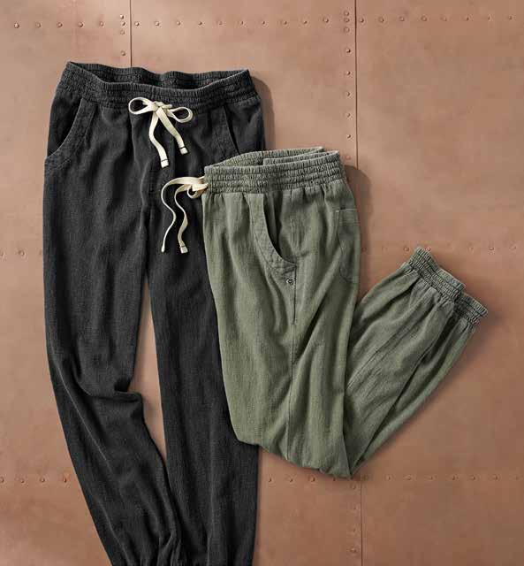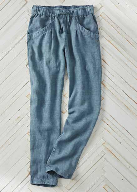 SCENIC ROUTE PANTS Made of the softest, most lightweight linen imaginable, these pants are made for long, warm days of doing nothing more than taking a stroll. Curved front pockets and a single drop-in pocket at the back. Pull-on styling with elastic waist and drawcord. Easy, slightly tapered leg. 100% linen. Imported in Indigo. Women’s sizes: XS-XL. [325037] $9 9
