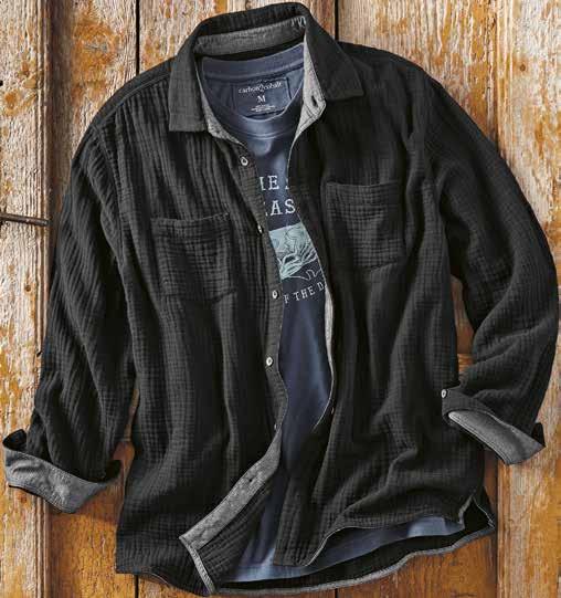 Playing off our beloved double-cloth construction, we tripled the cotton gauze layers on this shirt for an even more pillowy-soft feel. Featuring a unique puckered texture, we added herringbone fabric trim at the inner collar, button placket, and inner cuff to add structure. Locker loop at the outer back yoke. Side vents. Metal buttons. 100% cotton. Imported in Coal. [133792]