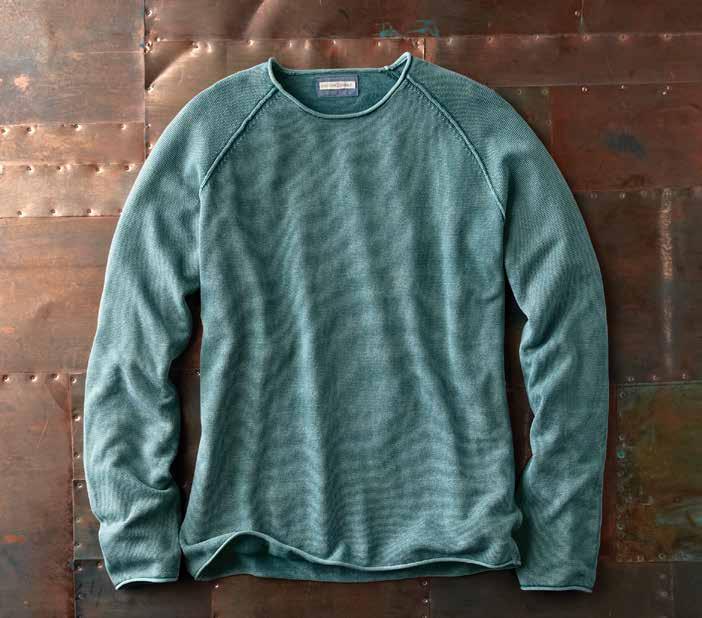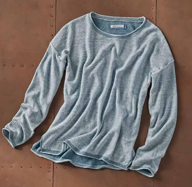 GLACE SWEATER In sun-washed sky blue, this lightweight, reverse jersey sweater is just substantial enough to ward off the errant chill. With a refined feel, it has rib-knit and rolled trim, and reversed out seams to add textural interest. 70% linen, 30% cotton. Imported in Ice Blue. Women’s Sizes: XS-XL. [355076] $9 9