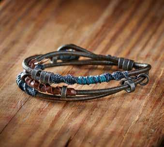 Pacifico Wrap Handcrafted by a collective of Fair Trade artisans, this wrap bracelet is made of one long, rugged leather strand interspersed with antiqued metal spacer beads, wrapped leather lacing, and waxed thread in subtle pops of dark and light blue. Loop and metal button closure. Imported in Multi. 24" long. Approx. 8 ½" wrapped. One size fits most. [188382] $34
