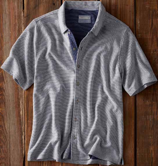 We found this cool pique knit — only to find that its flip side was even cooler, so we reversed it to show off the gray side with peeks of navy blue contrast from the inside. Supple, soft-draping, and texturally pleasing, this polobutton-down hybrid is finished with blue-gray oxford along the inner neckline, inner button placket, and side vents to give it a polished, date-night feel. 81% cotton, 19% poly. Imported in Natural. [144264]
