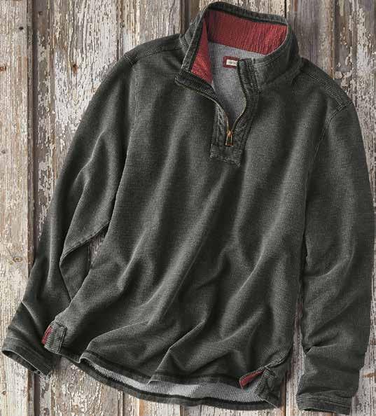 Cool details to spare in this pullover. Made of lightweight French terry with a superfine, rib-knit look and feel, the dye is rolled onto the outside to create the handsome, charcoal gray coloration and the pop of red along the inside of the collar. Washed to a denim-like fade, it has an open bottom hem and side vents. 95% cotton, 5% spandex. Imported in Coal. [144399]