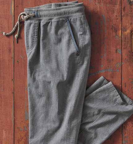 Knockabout Pants Your new weekend pants. Made of a finely textured woven fabric, they offer a more refined look with a rib-knit elastic waist for sweats-level comfort. Deniminspired details include chambray-trimmed front slash pockets with a rivet accent. Contrast drawcord. Easy tapered leg. Two drop-in back pockets. 32½" inseam. 100% cotton body. Imported in Steel Blue. Men’s sizes: S-XXL. [125079] $99