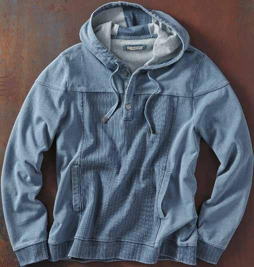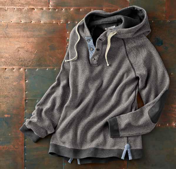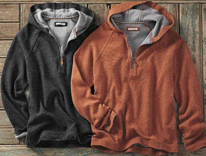 Constellation Hoodie With a donegal-like flecked yarn on the outside and t-shirt soft jersey lining, this double-knit hoodie has refined looks and a comfy feel inside and out. Perfectly weighted for year-round wear, it has a quarter zip with antiqued hardware. 93% cotton, 4% poly, 3% viscose. Imported in Charcoal or Rust. Men’s sizes: S-XXL. [144549] $129