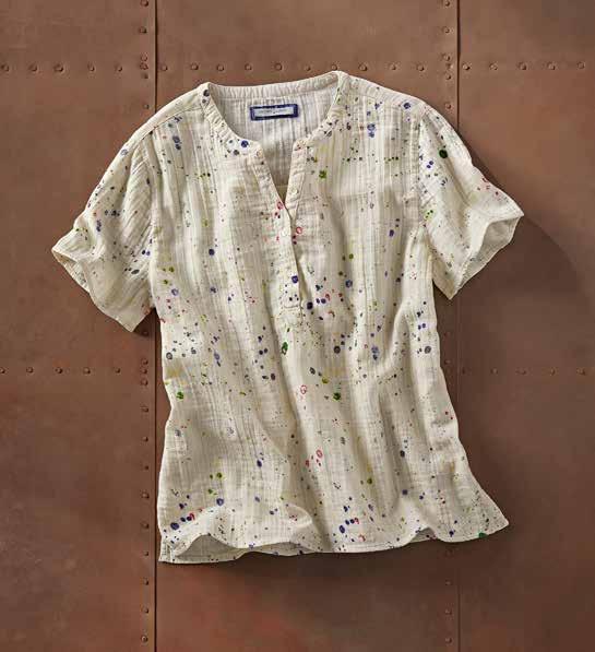 Our cloud-soft double cloth is freshened up for warmer weather with short sleeves and a unique spray print. Flattering, fourbutton split-v neckline. Side vents. 100% cotton. Imported in Multi. Women’s sizes: XS-XL. [333143] $ 89