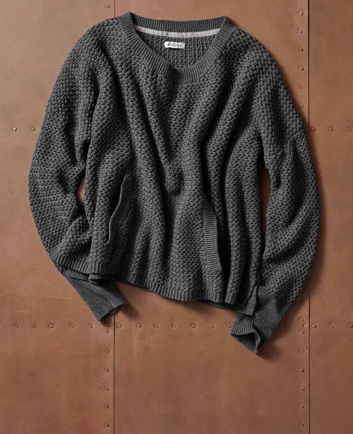 TIDELINE SWEATER We love a sweater with style and functionality. Case in point – this pullover with a delightfully textured wavy stitch and a convenient kangaroo pocket. Soft and substantial, it’s also breathable due to the slightly open weave. Softly rounded neckline. Rib-knit trim. Slightly cropped with a high-low hem. Side vents. 100% cotton. Imported in Gray. Women’s sizes: XS-XL. [355094] $ 99