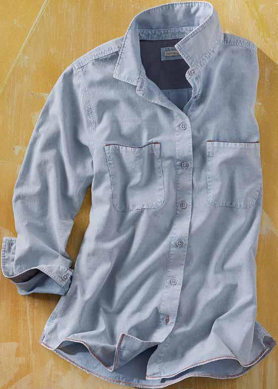 CANYON CHAMBRAY Kissed with a vintage patina and a washed-a-thousand-times soft feel, this lightweight chambray shirt is effortlessly classic-cool. Denim-inspired contrast cover stitch at the hem with contrast fabric accents throughout. 100% cotton. Imported in Sky Blue. Women’s Sizes: XS-XL. [333150] $ 89